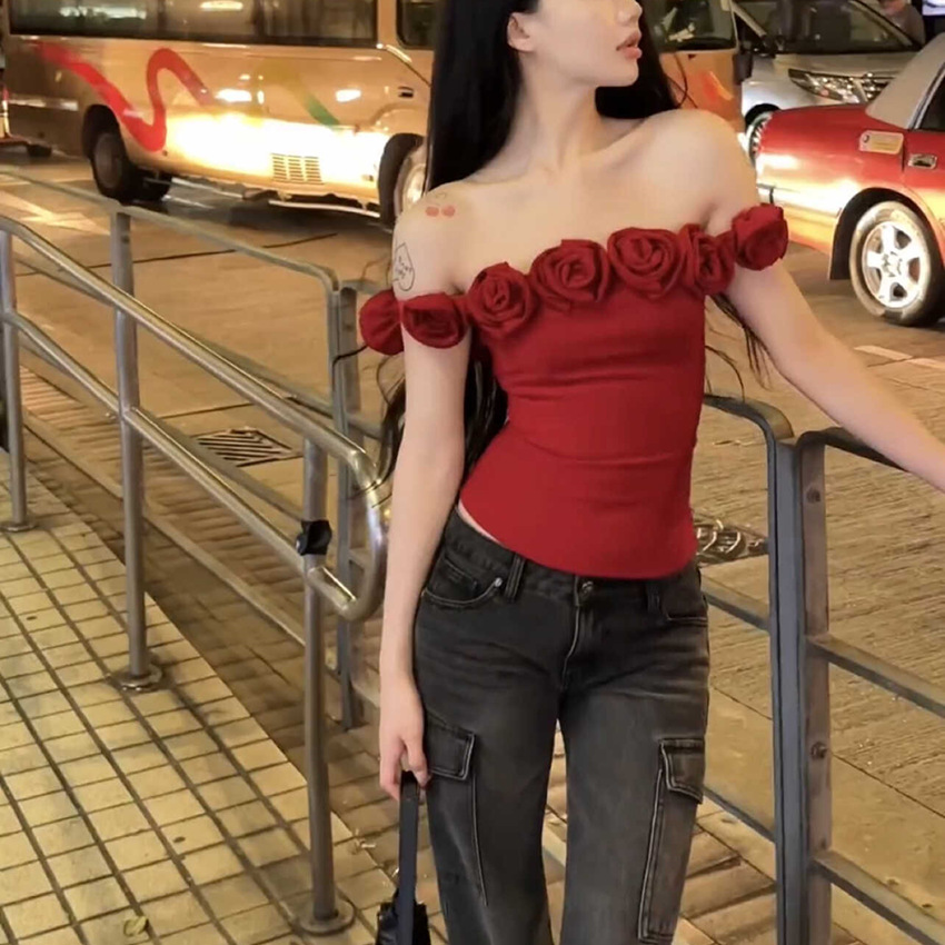 立体玫瑰花抹胸上衣女辣妹绝美露肩锁骨红色吊带背心