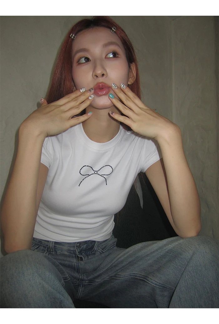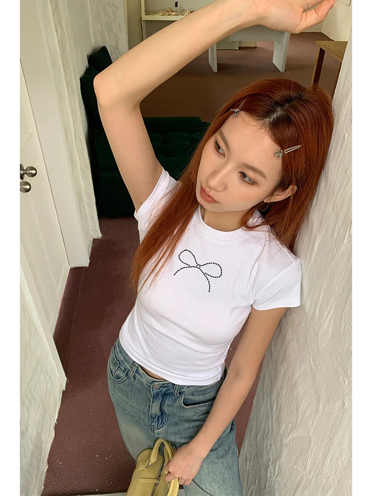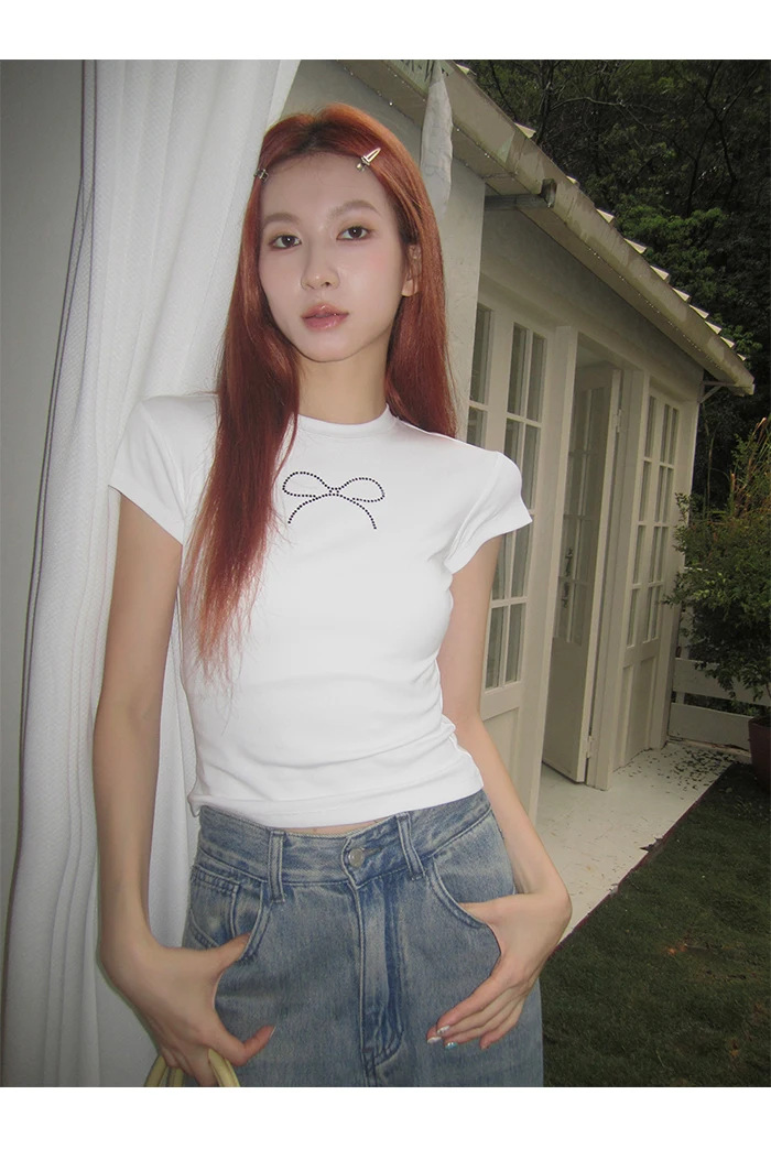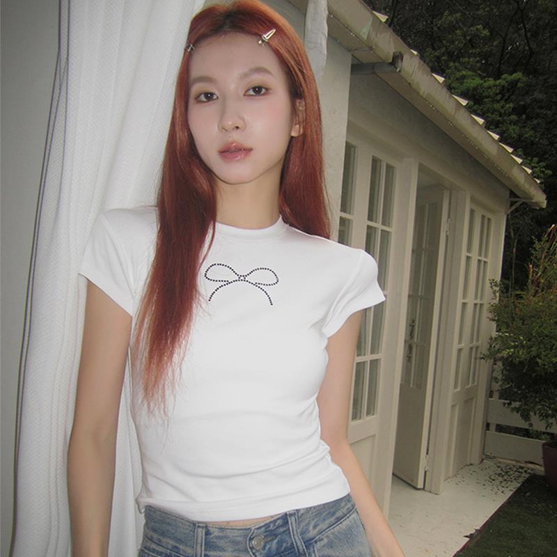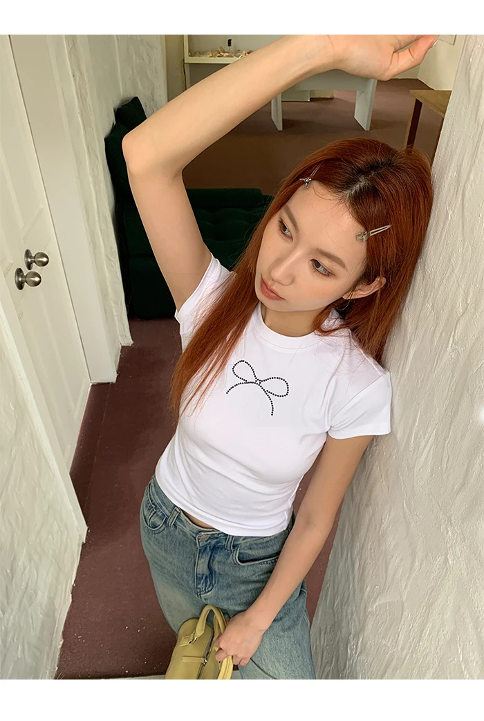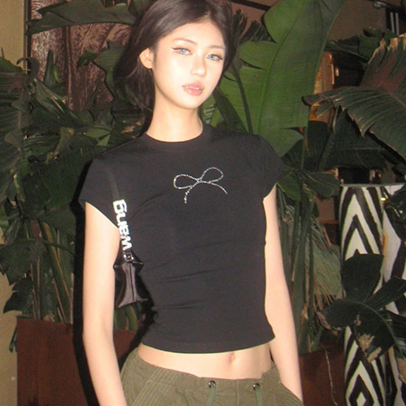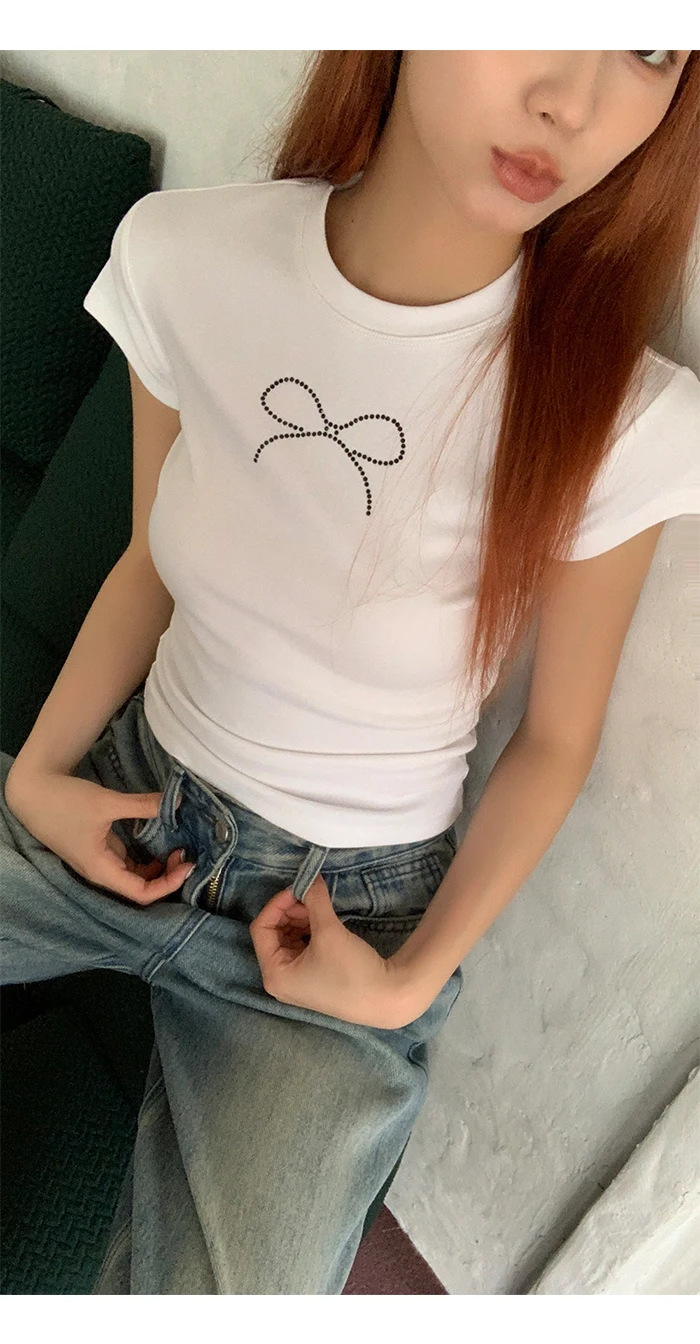 夏季新款圆领套头短袖蝴蝶结露脐欧美女装上衣T恤烫钻短款女