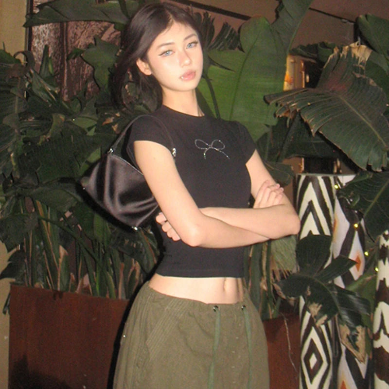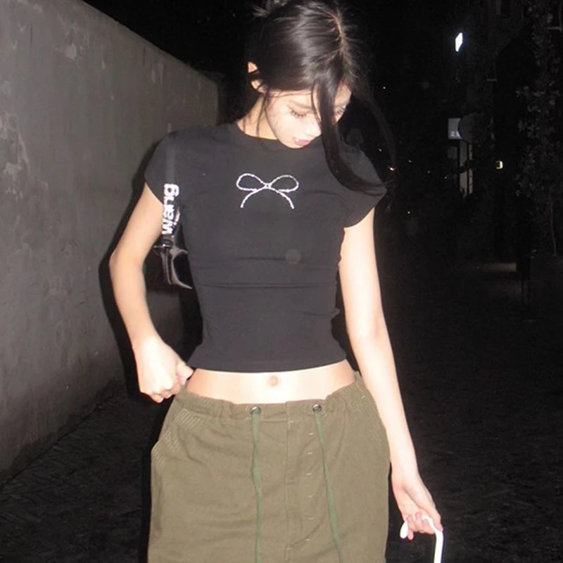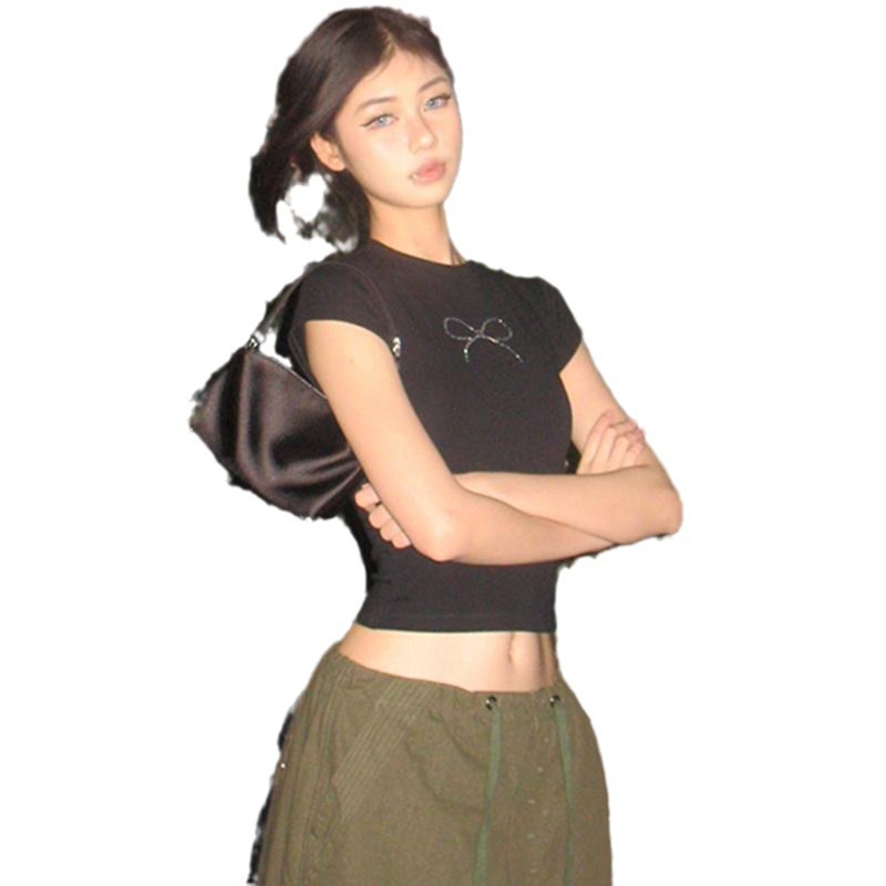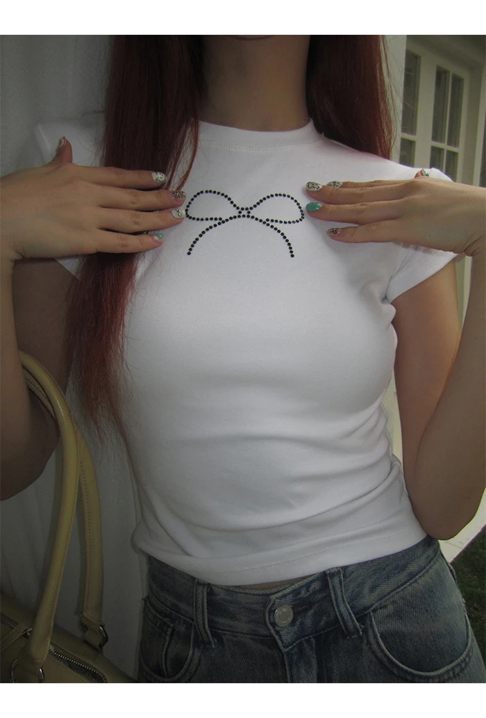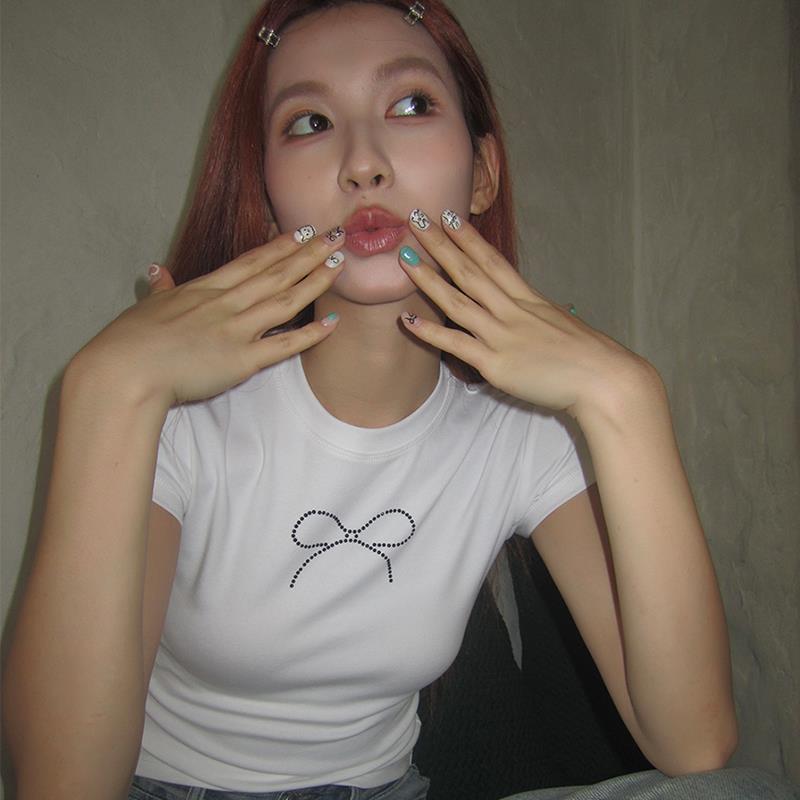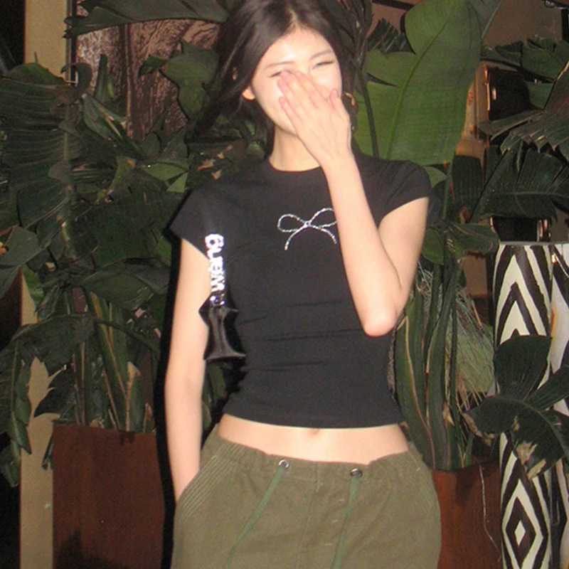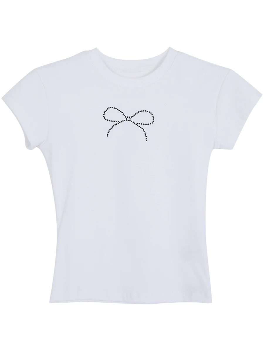 夏季新款圆领套头短袖蝴蝶结露脐欧美女装上衣T恤烫钻短款女