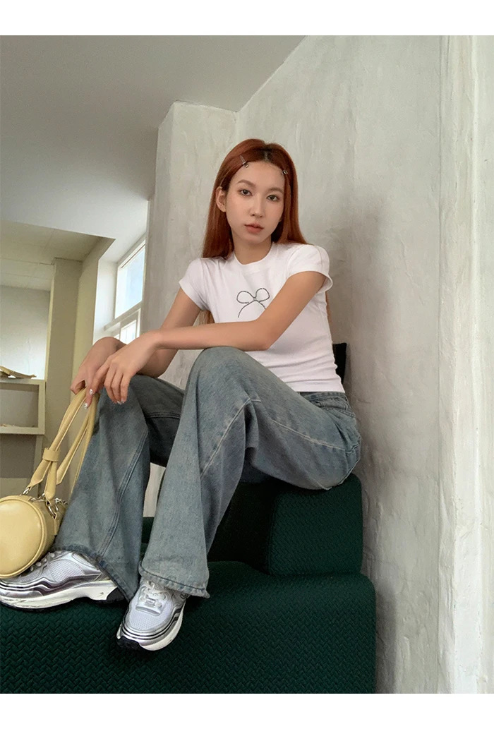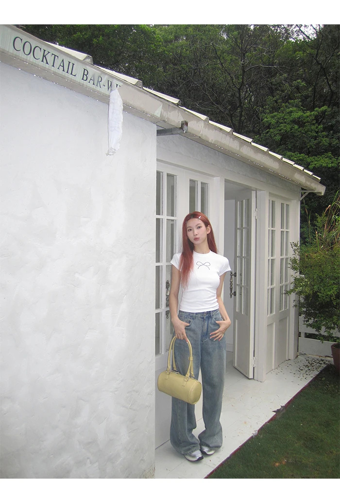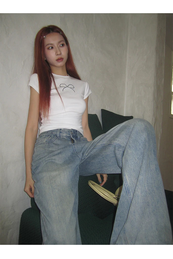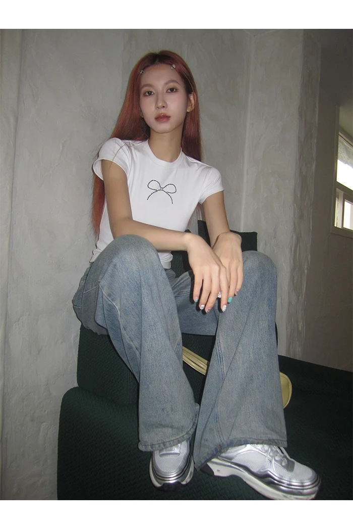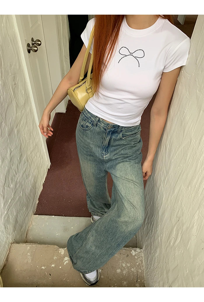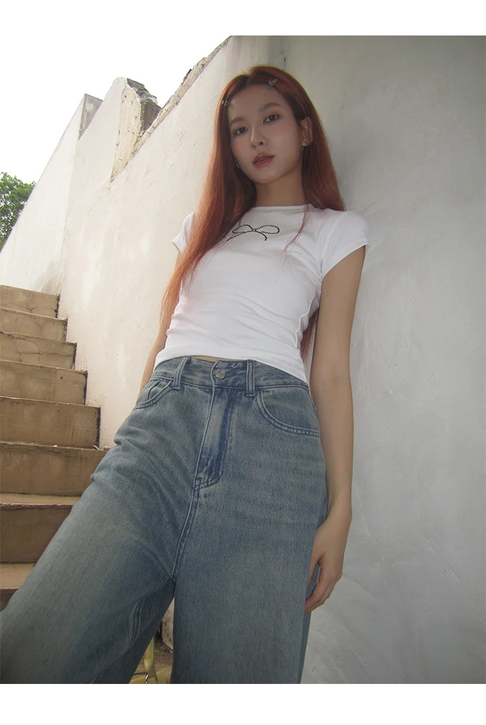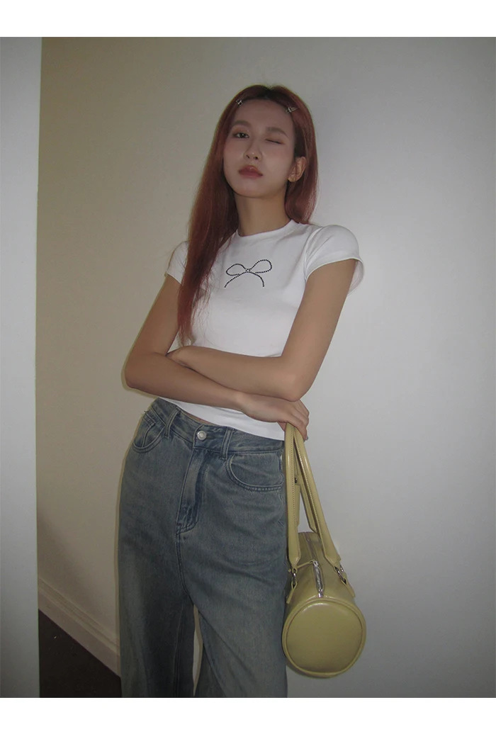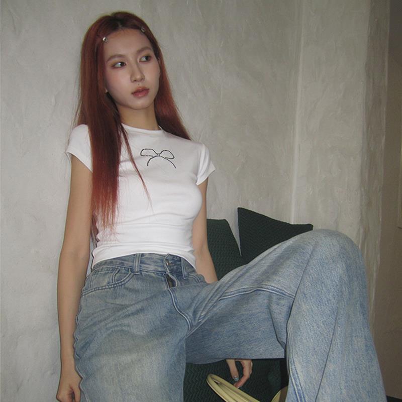 夏季新款圆领套头短袖蝴蝶结露脐欧美女装上衣T恤烫钻短款女