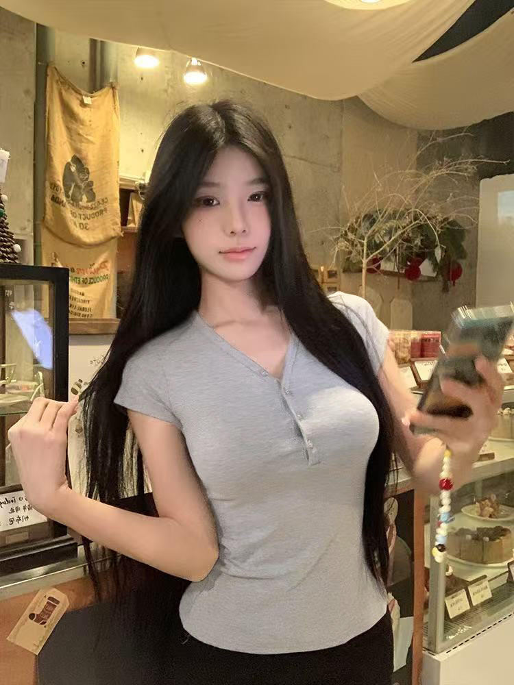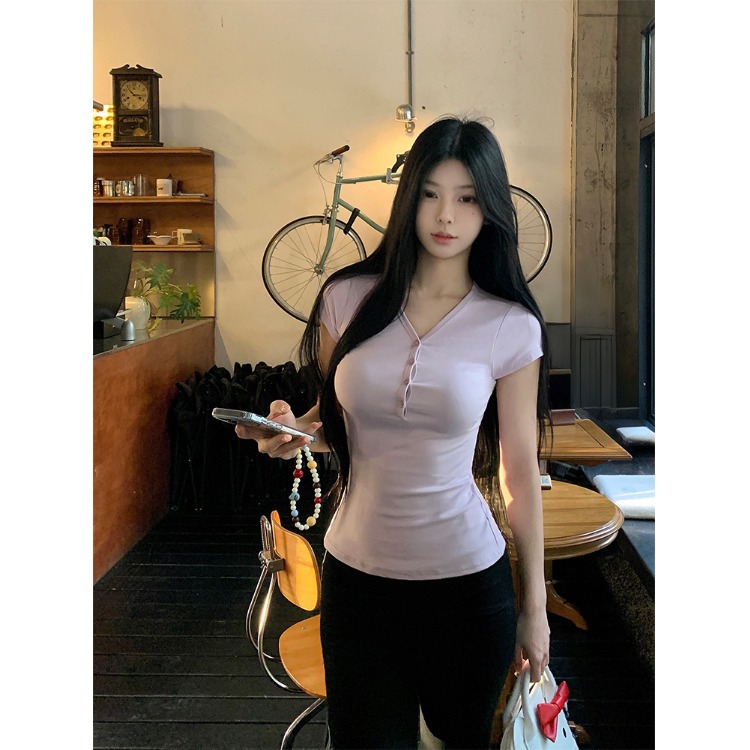 美式复古V领纽扣短袖T恤女夏季新款纯欲百搭修身显瘦内搭打底上衣