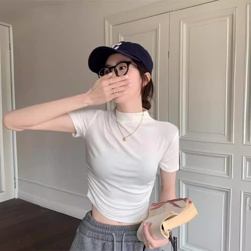半高领短袖t恤女夏季年新款打底衫内搭修身短款学生皱褶上衣