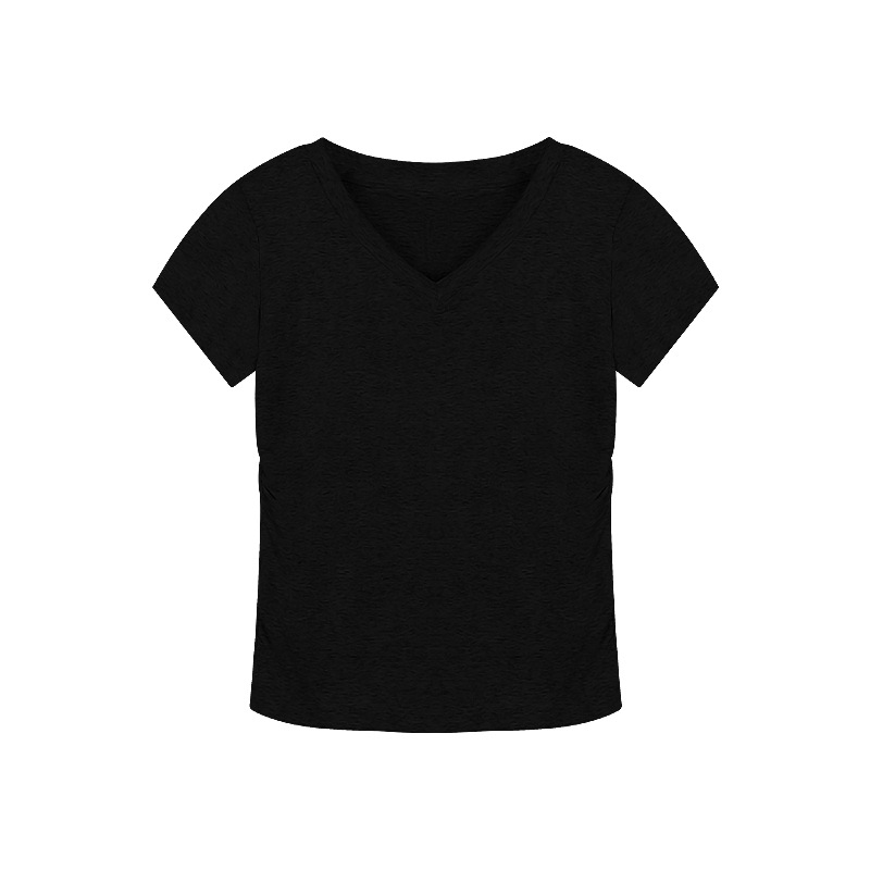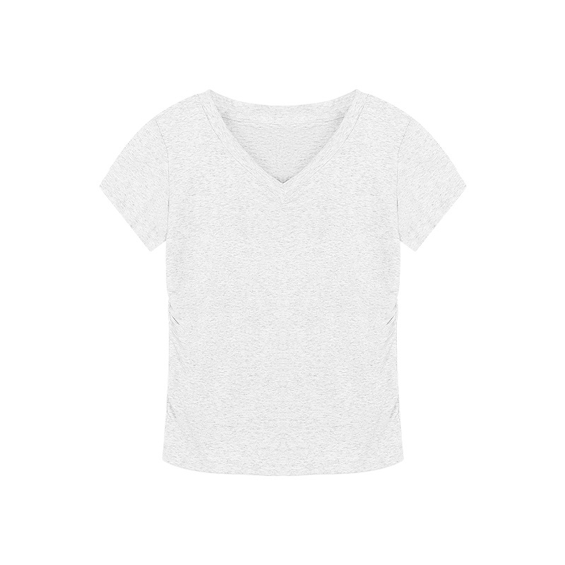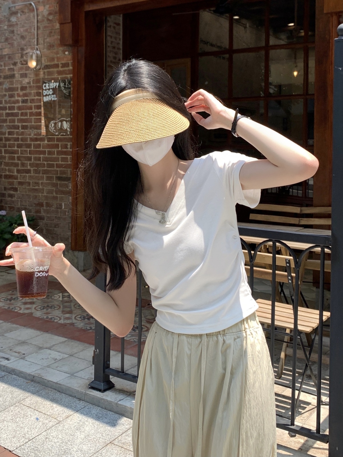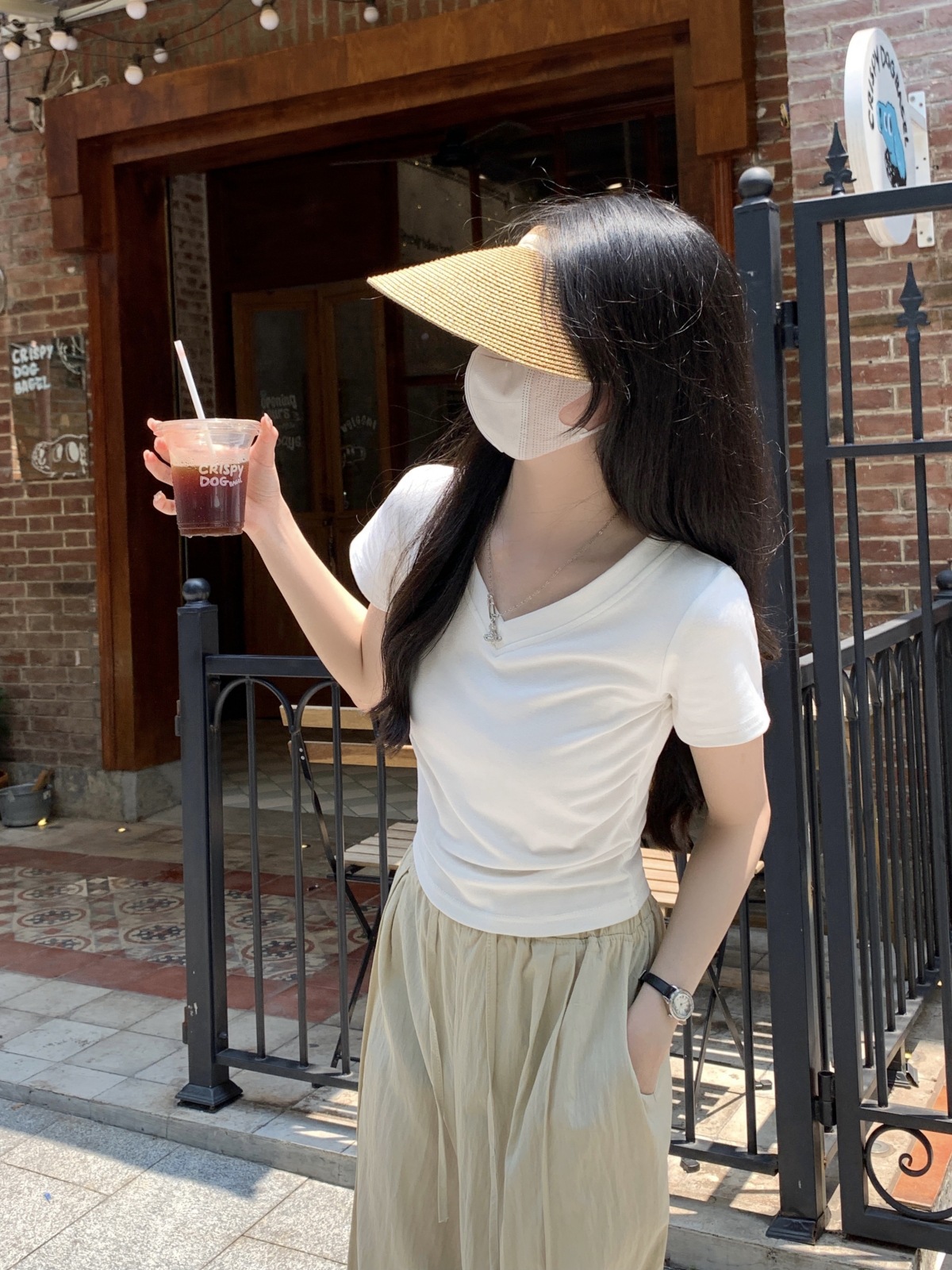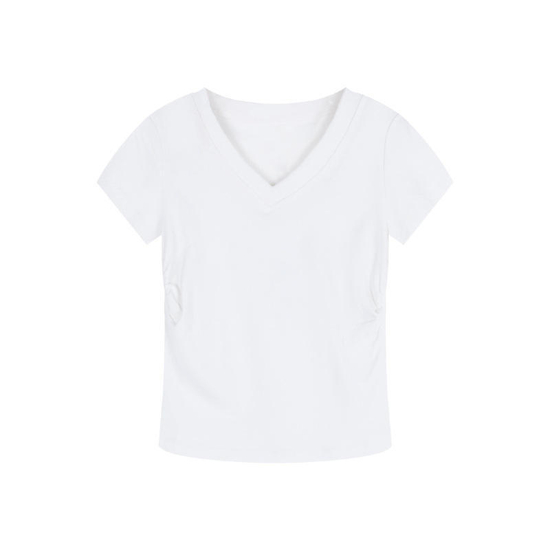 V领短袖T恤女装2025夏季新款正肩修身显瘦褶皱短款学生纯色上衣潮