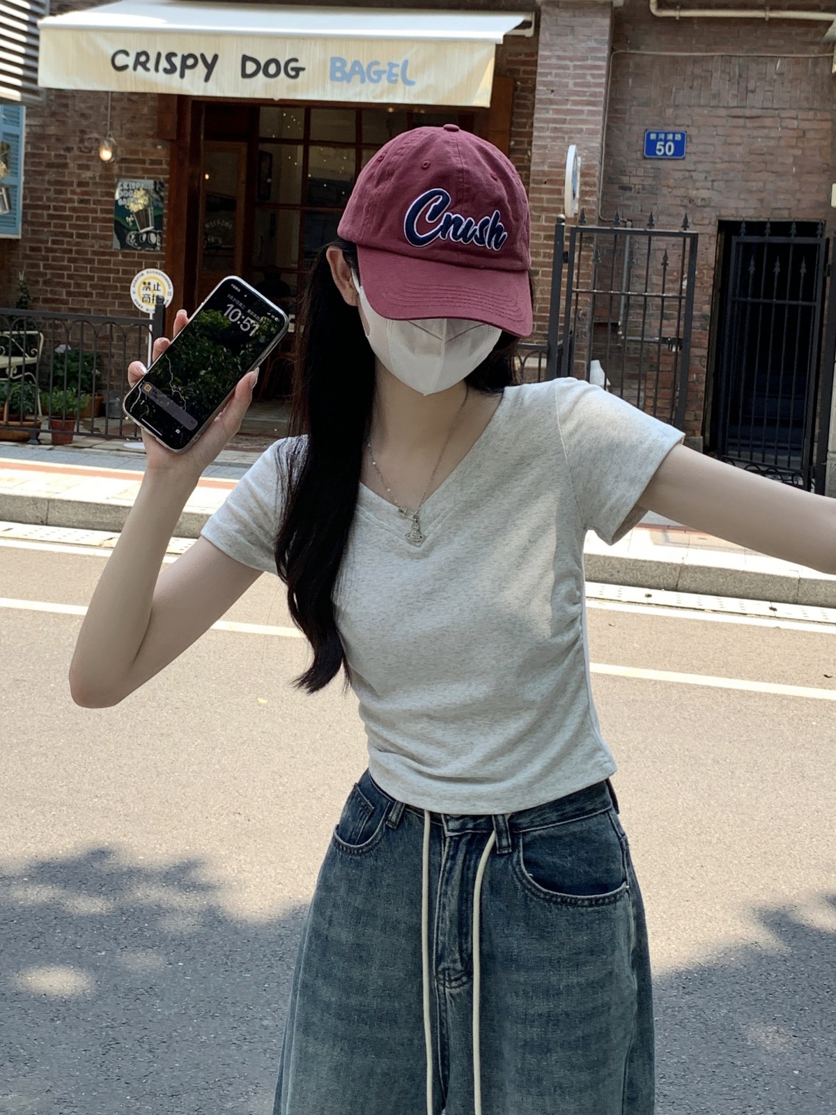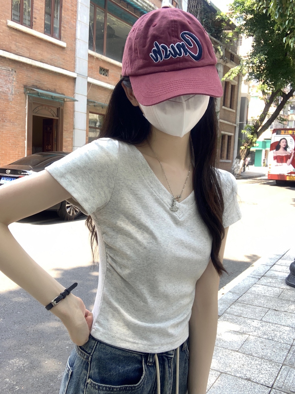 温柔设计感小众V领灰色短袖T恤女装夏季正肩修身显瘦褶皱短款上衣