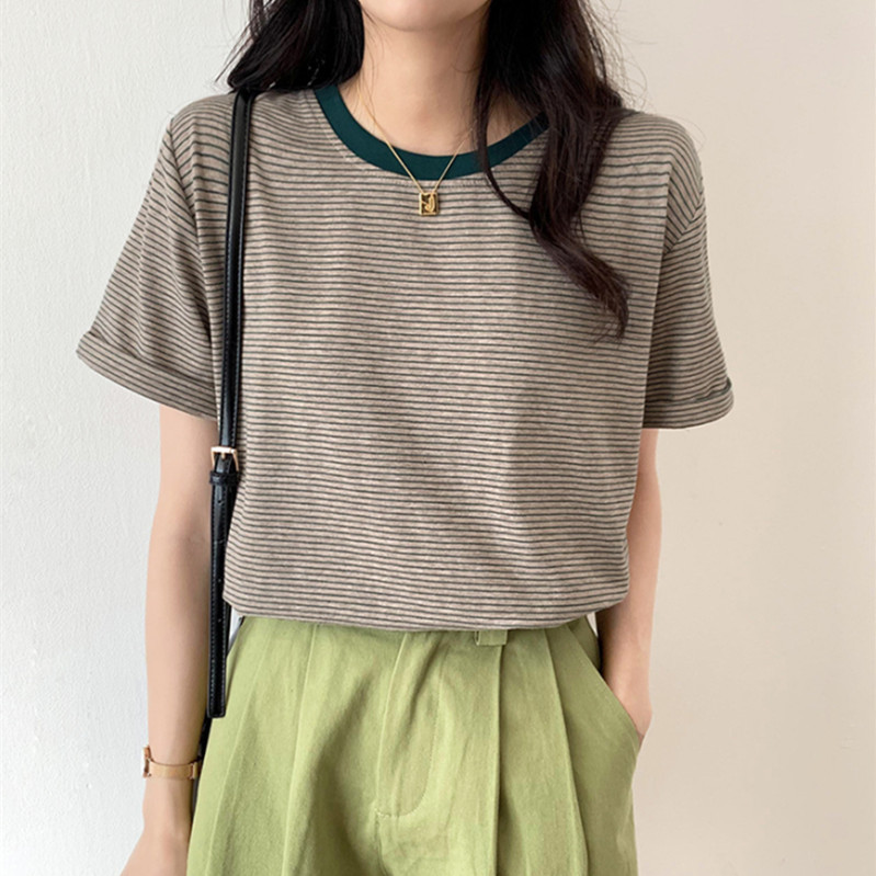 条纹T恤短袖女夏装新款圆领宽松ins小心机洋气简约学生上衣