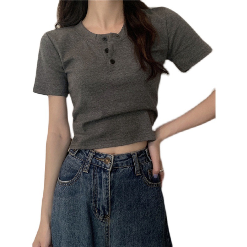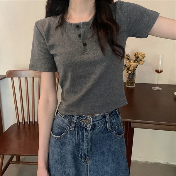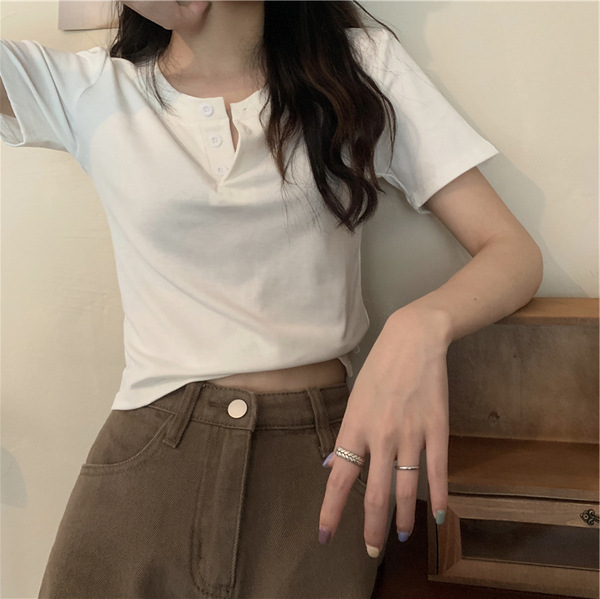 6535棉夏季超火设计感小众纽扣短袖T恤女短款高腰修身上衣服