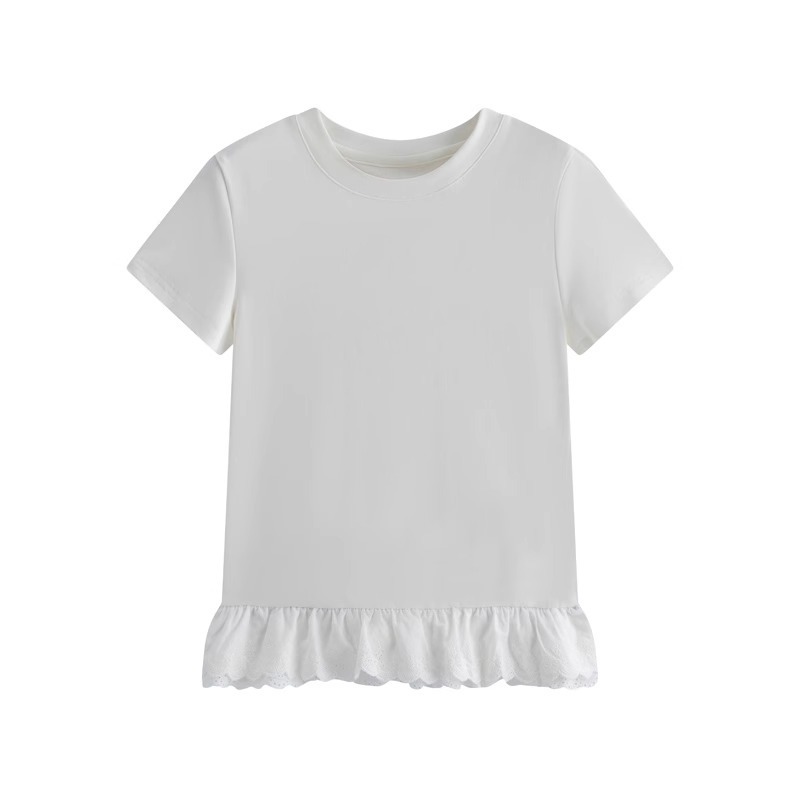 2025新款白色拼接蕾丝边短袖t恤衫女夏季设计感短款正肩小衫上衣