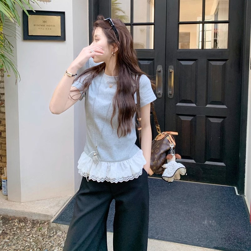 2025新款拼接蕾丝边短袖t恤衫女夏季设计感短款正肩小衫学生上衣