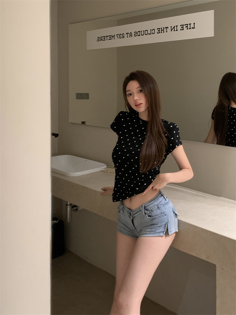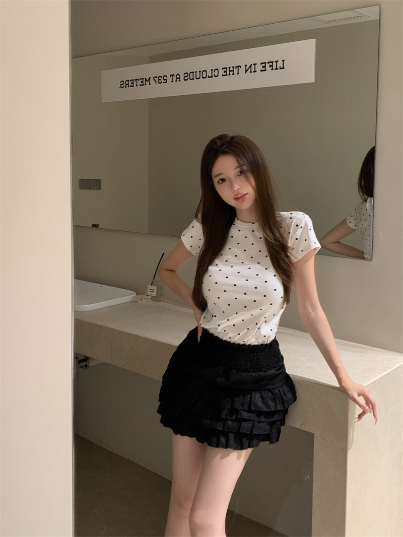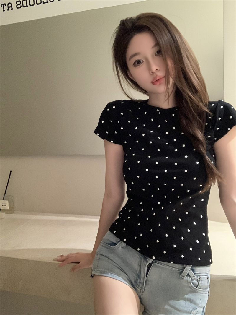 复古波点圆领短袖T恤女装夏季短款修身显瘦内搭休闲学生上衣