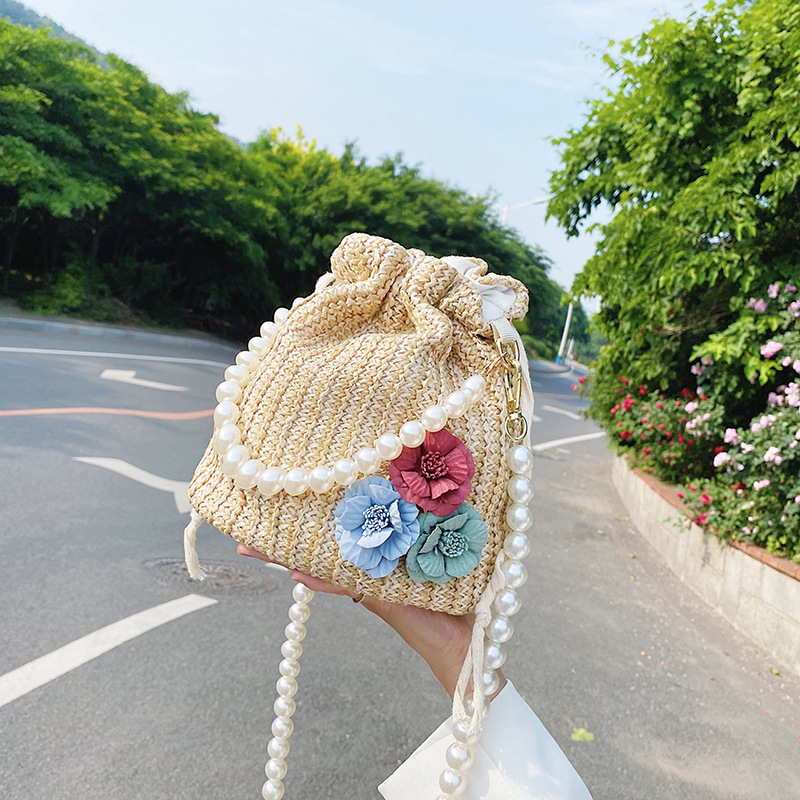 2025新款草编夏日沙滩田园风手提包 珍珠链小雏菊时尚简约单肩包