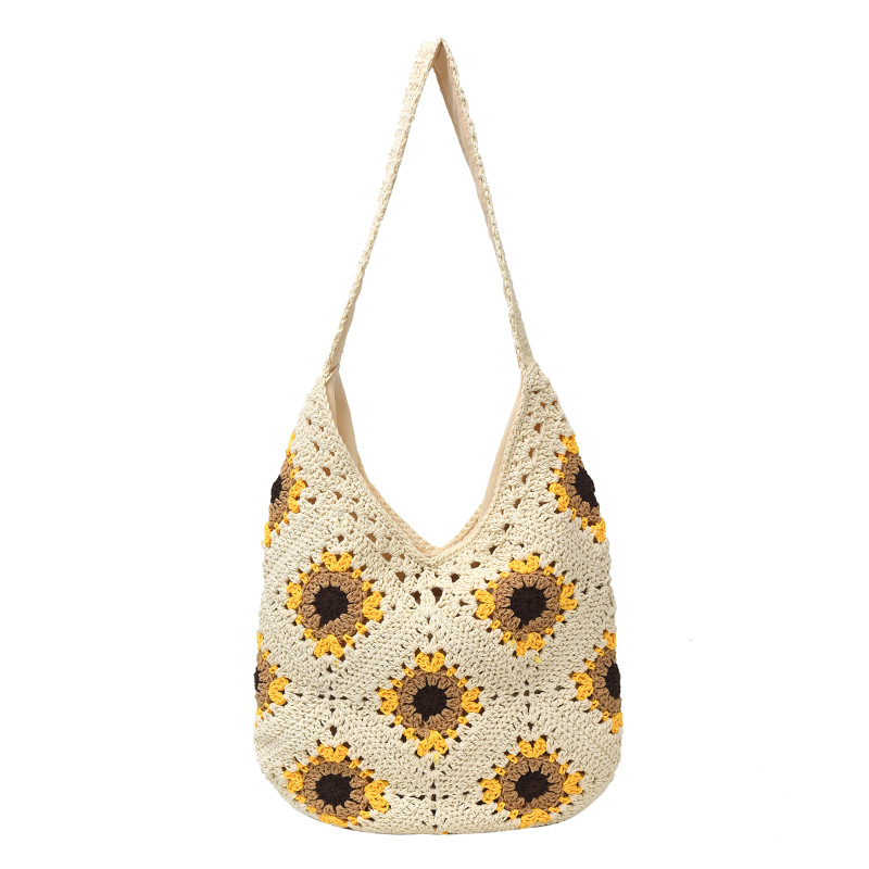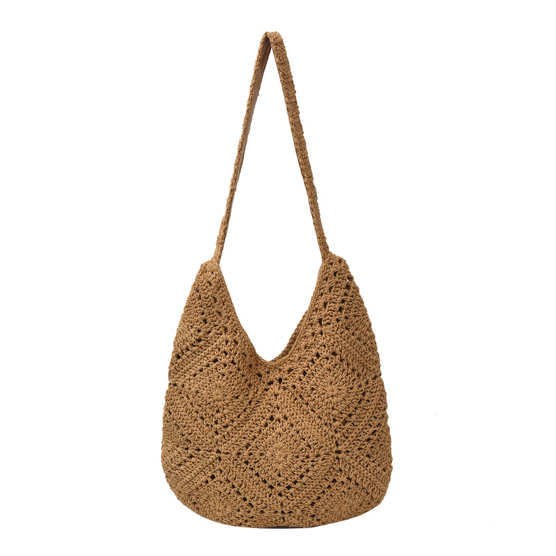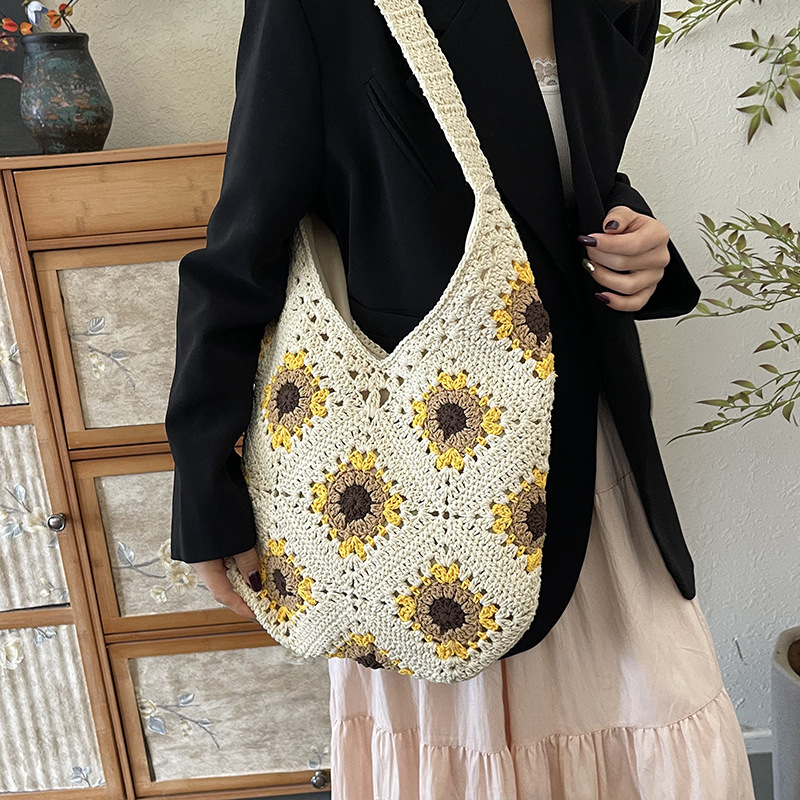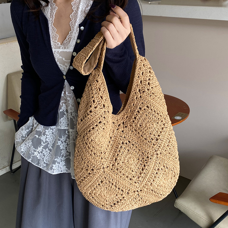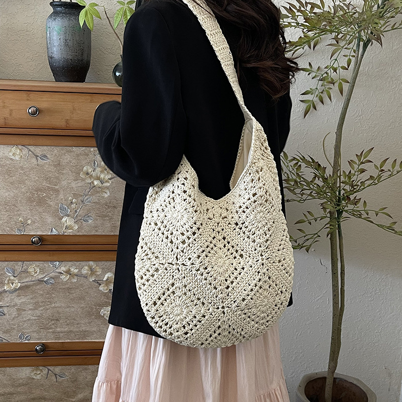 大容量编织包2025新款勾花单肩包森系镂空棉线沙滩包度假托特包包
