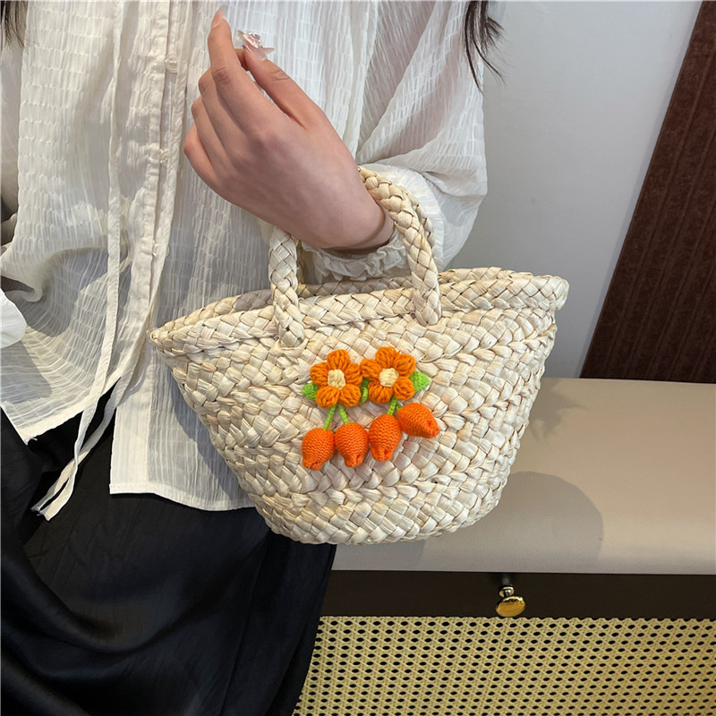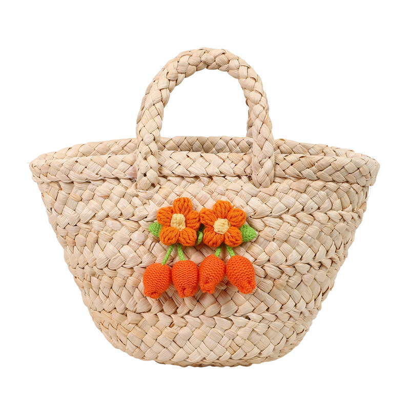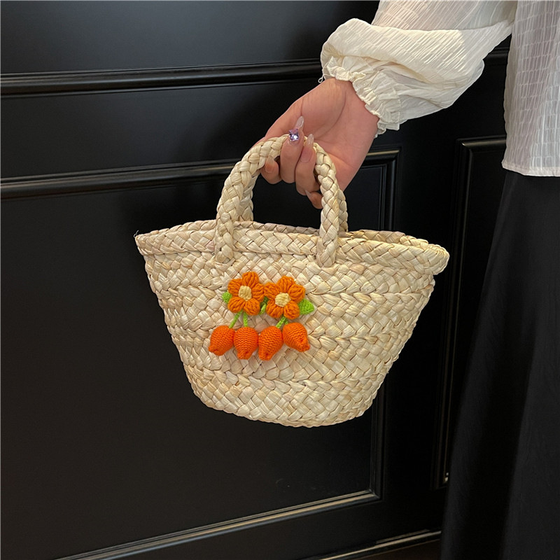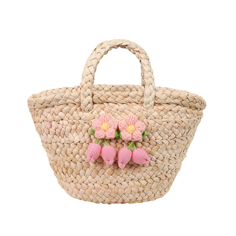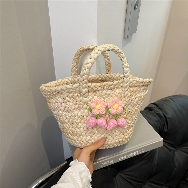 时尚可爱菜篮子包包女2025夏季休闲可爱针织花朵挂件编织手提包女