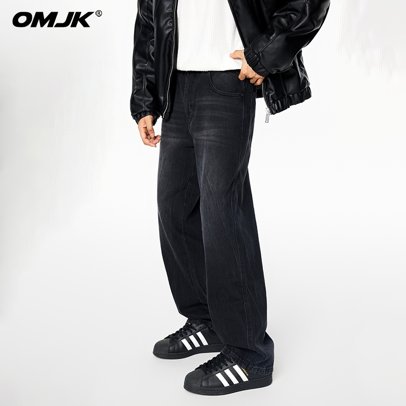 OMJK黑色男士牛仔裤秋冬季新款美式高街裤子男宽松直筒长裤潮