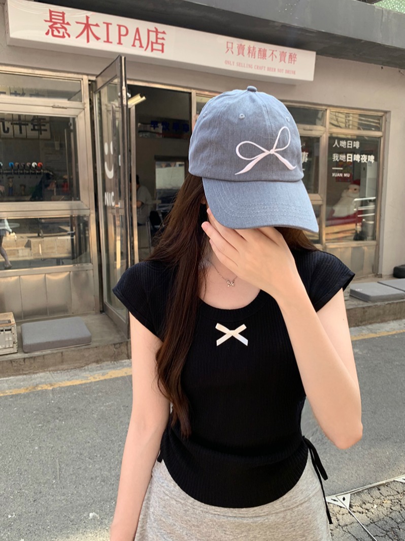 5806#蝴蝶结圆领短袖针织衫韩系温柔抽绳褶皱不规则修身短款上衣