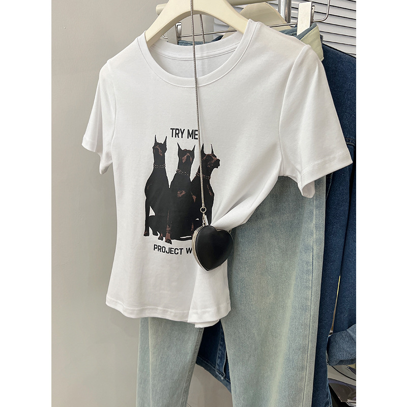 黑色印花t恤女短袖正肩美式复古半袖圆领修身短上衣女小个子