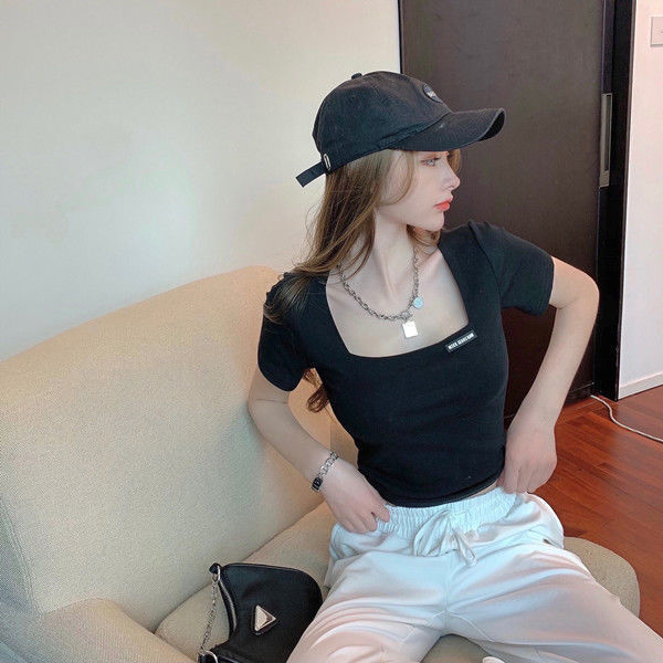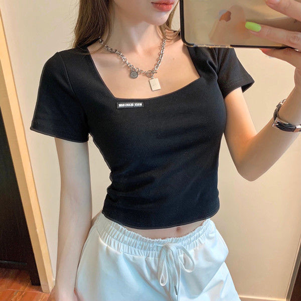 复古法式方领短款高腰露脐短袖t恤女士修身夏季打底衫上衣潮