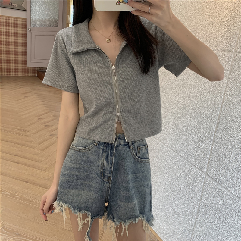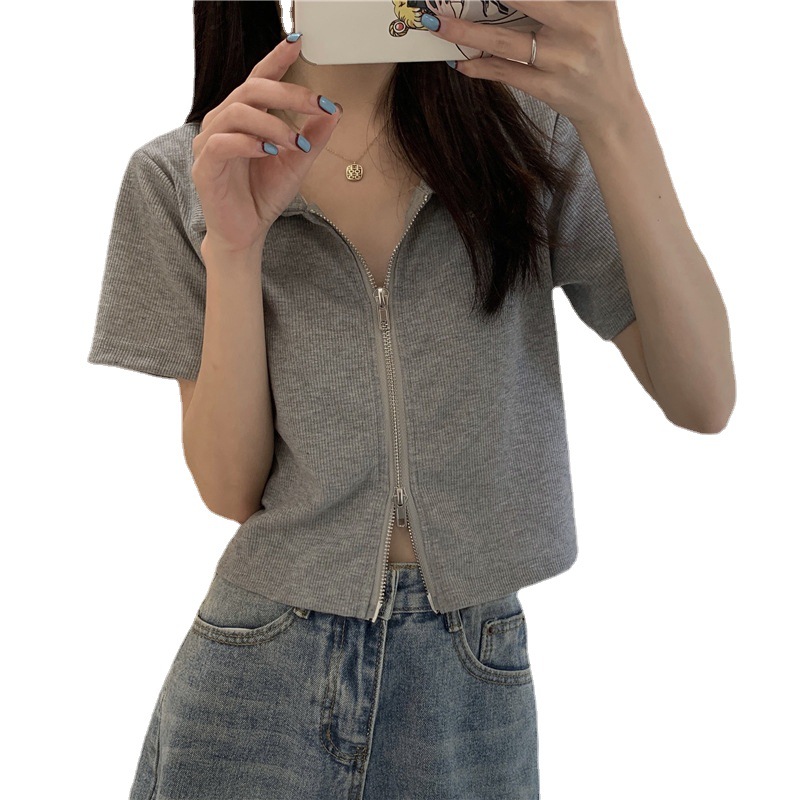 8406# 百合 已出货 罗纹 polo领夏设计感双拉链短袖上衣ins潮