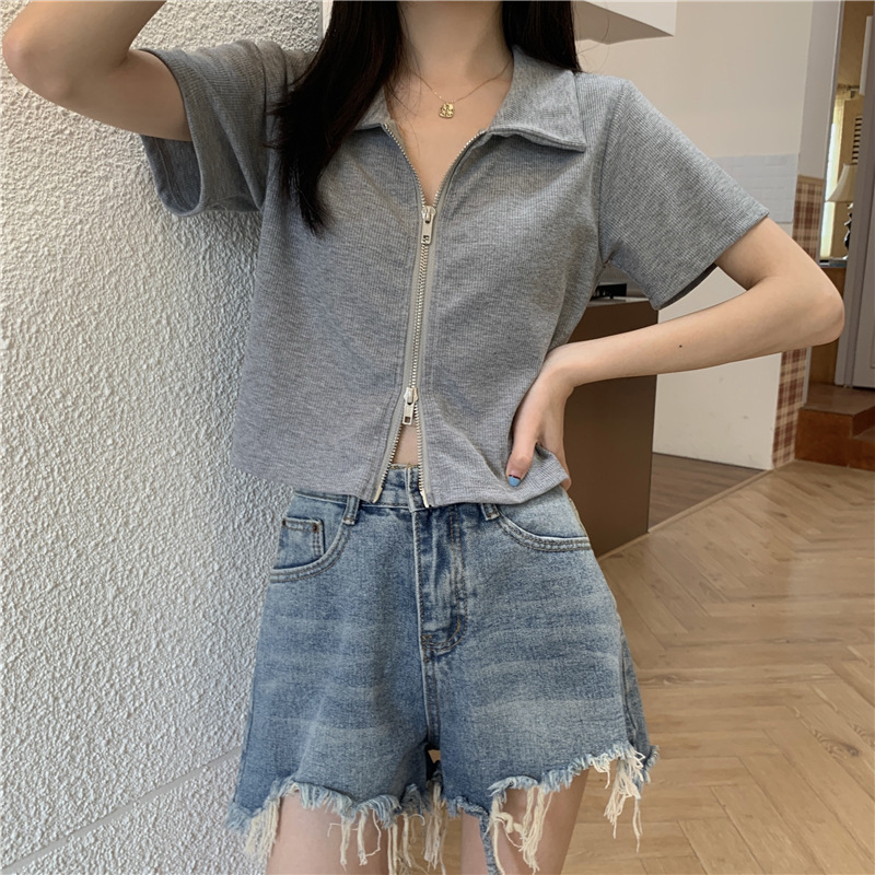 短款t恤女翻领Polo衫学生拉链开衫修身高腰露脐短袖上衣设计感夏