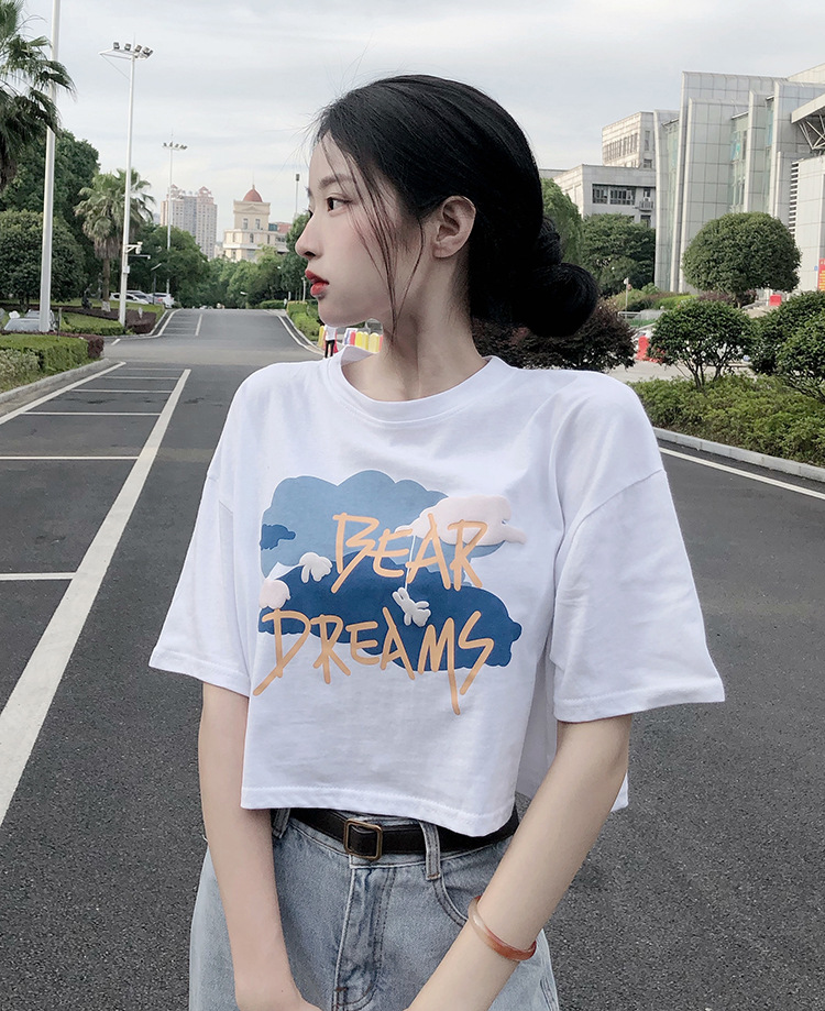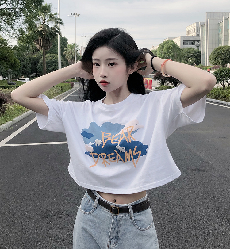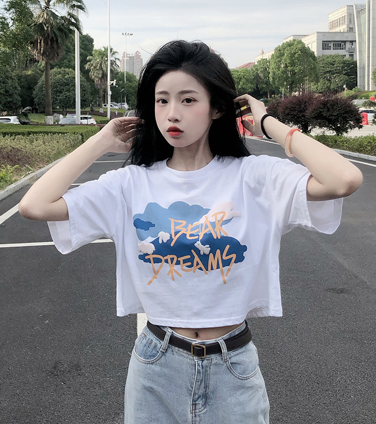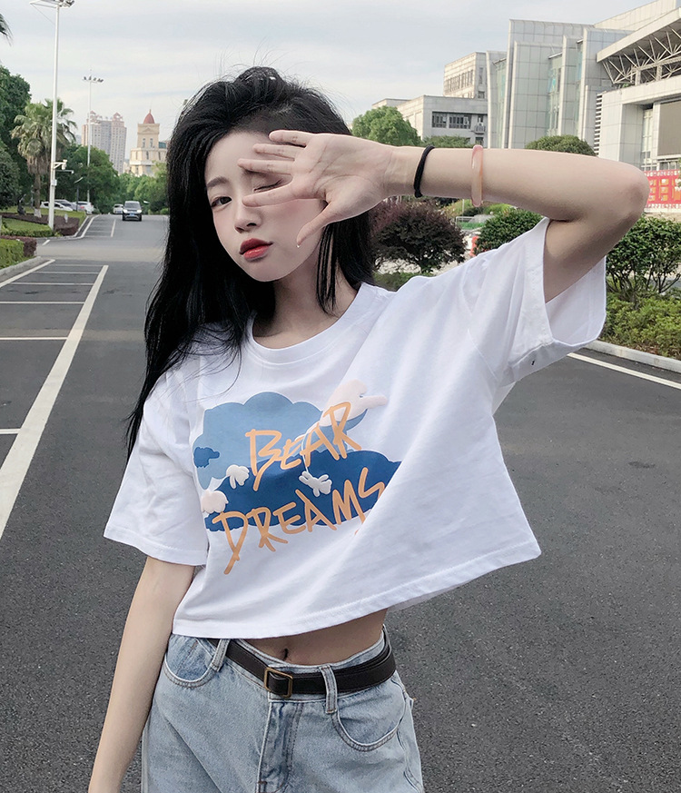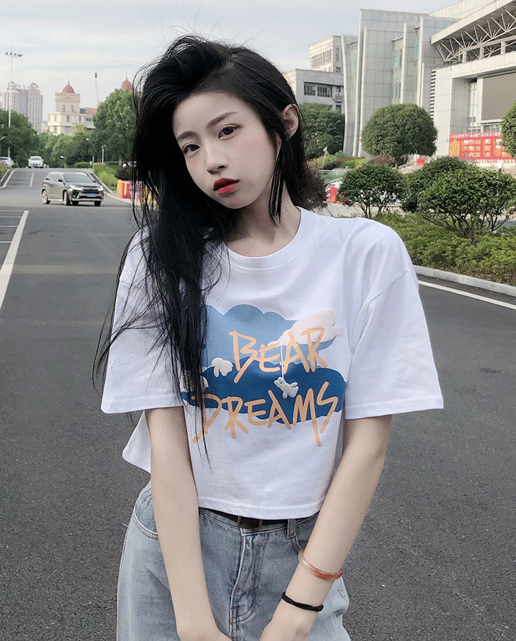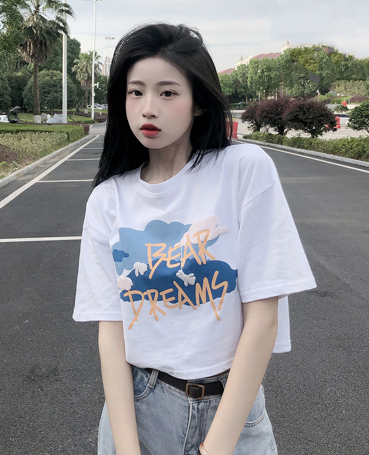 白色宽松t恤女夏季新款韩版印花发泡设计感高腰短款短袖上衣