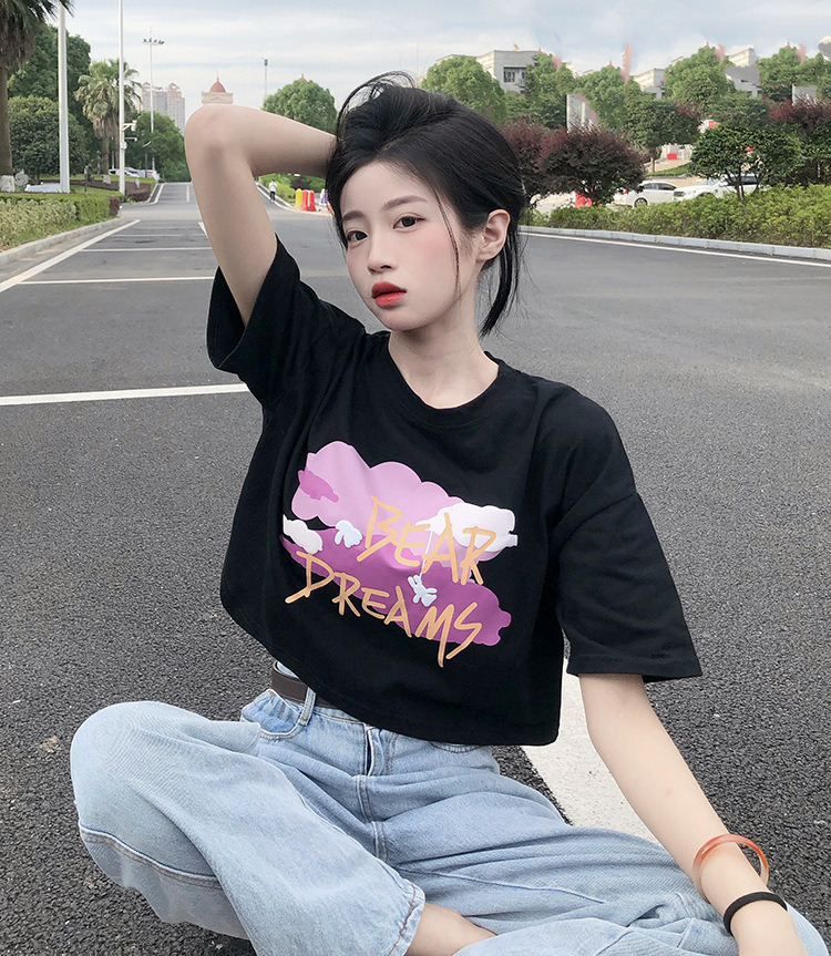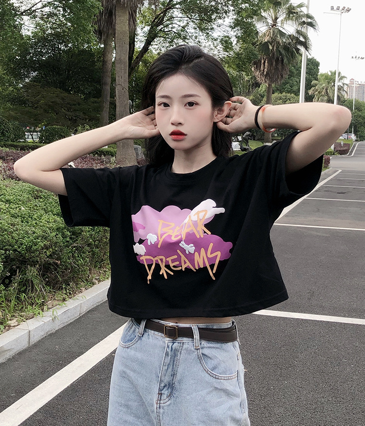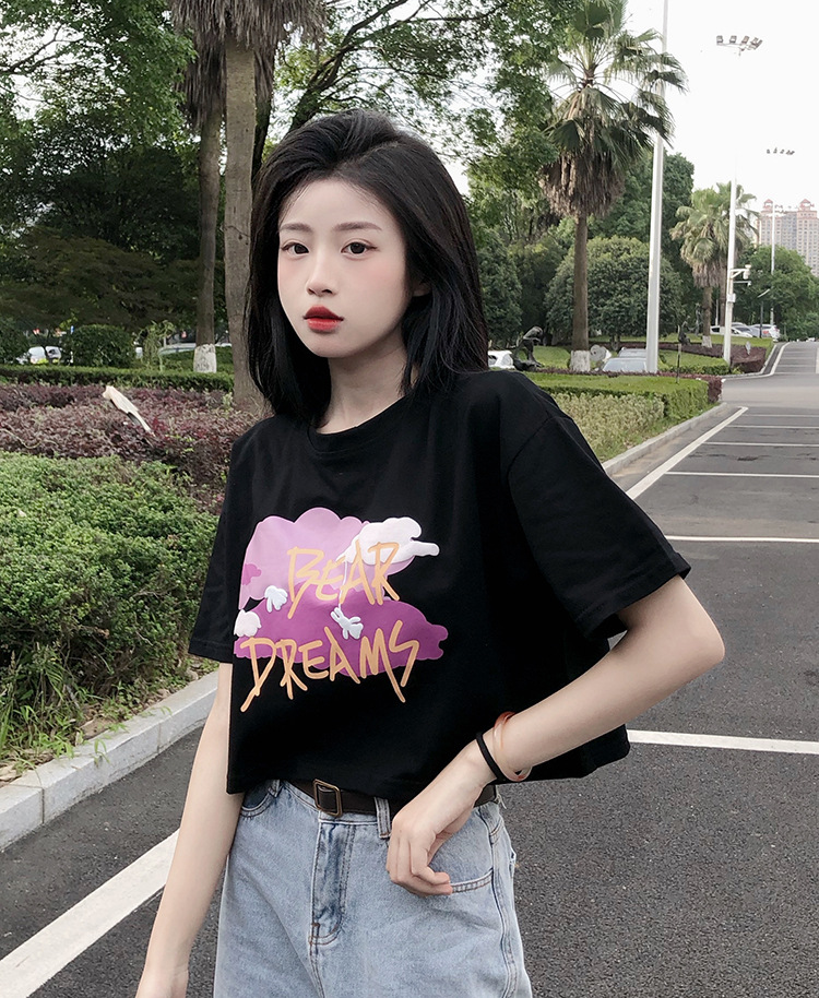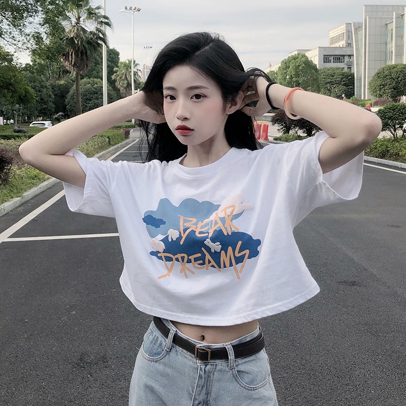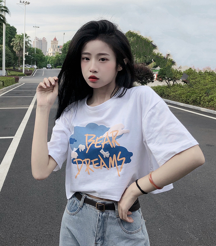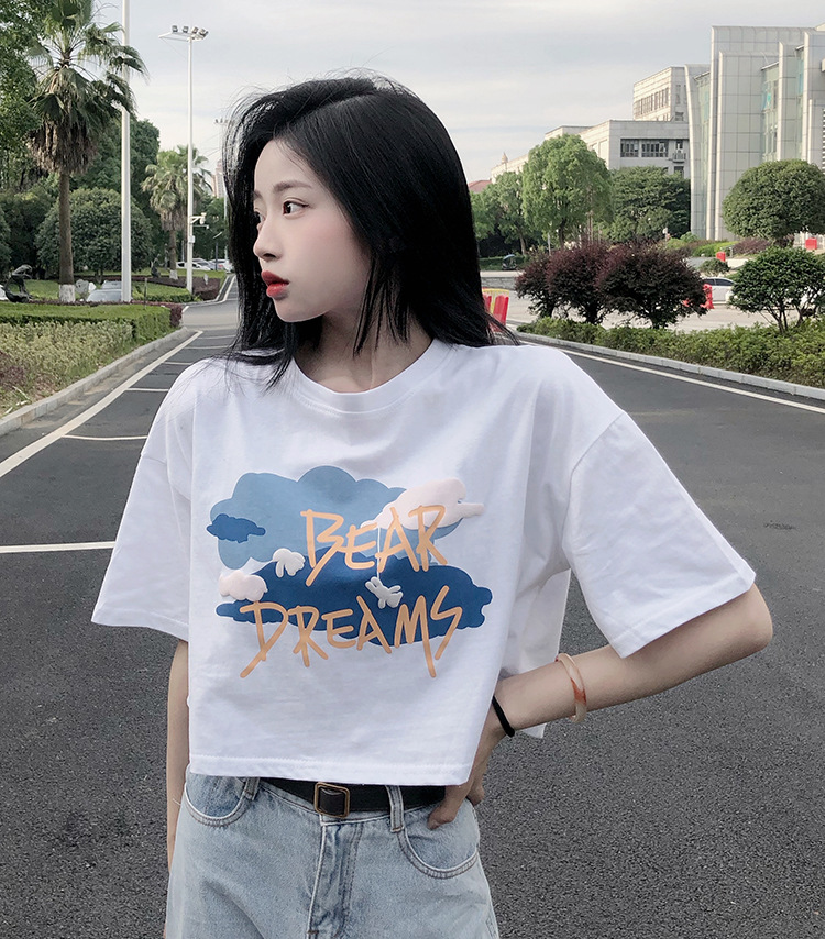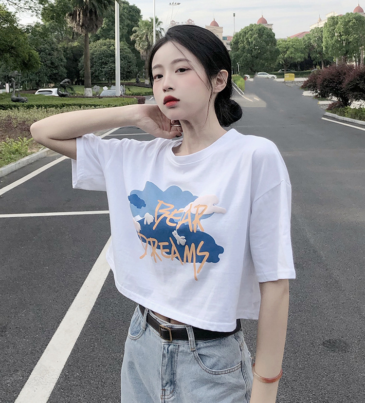 白色宽松t恤女夏季新款韩版印花发泡设计感高腰短款短袖上衣