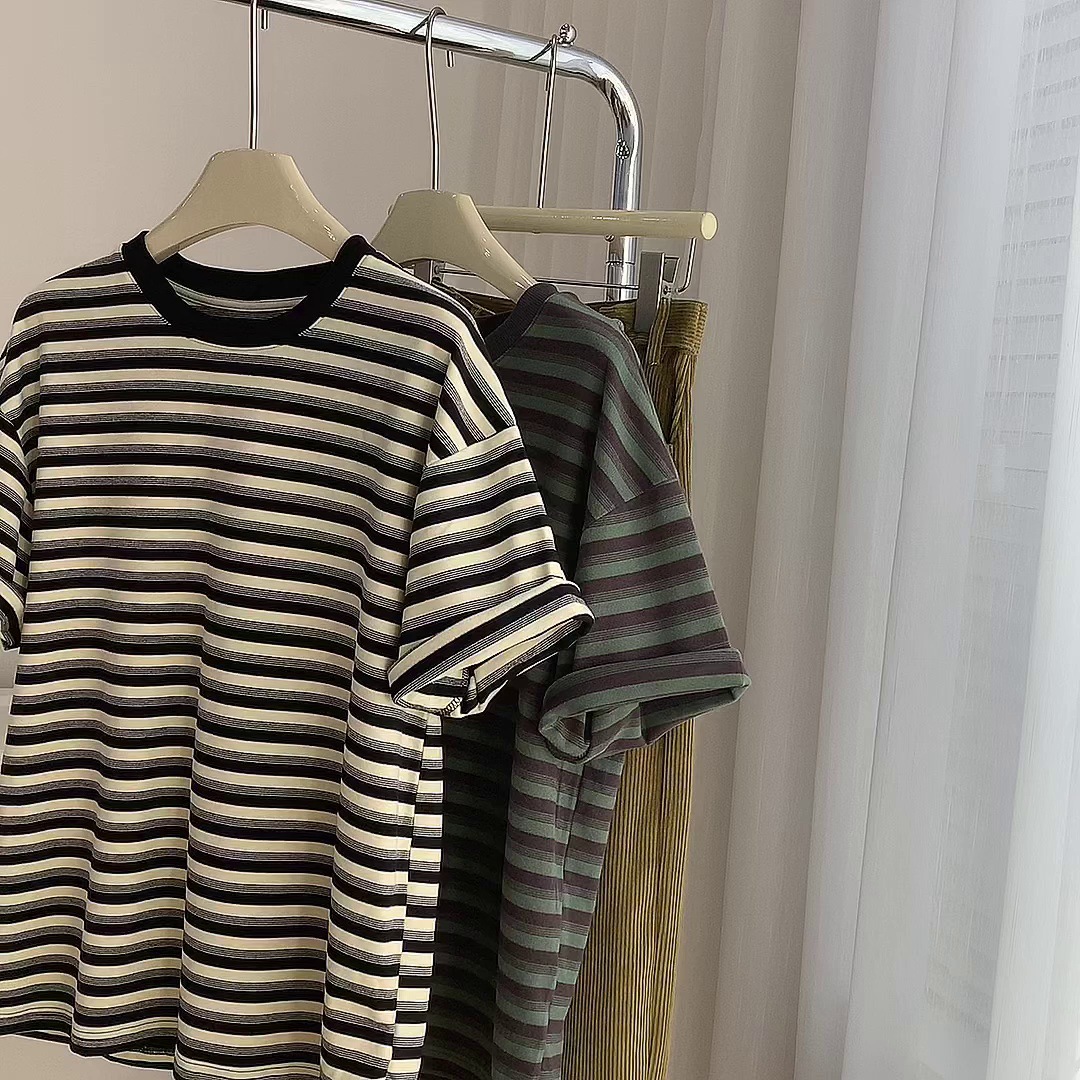 复古绿色条纹短袖t恤女宽松大码慵懒风打底衫上衣夏季新款