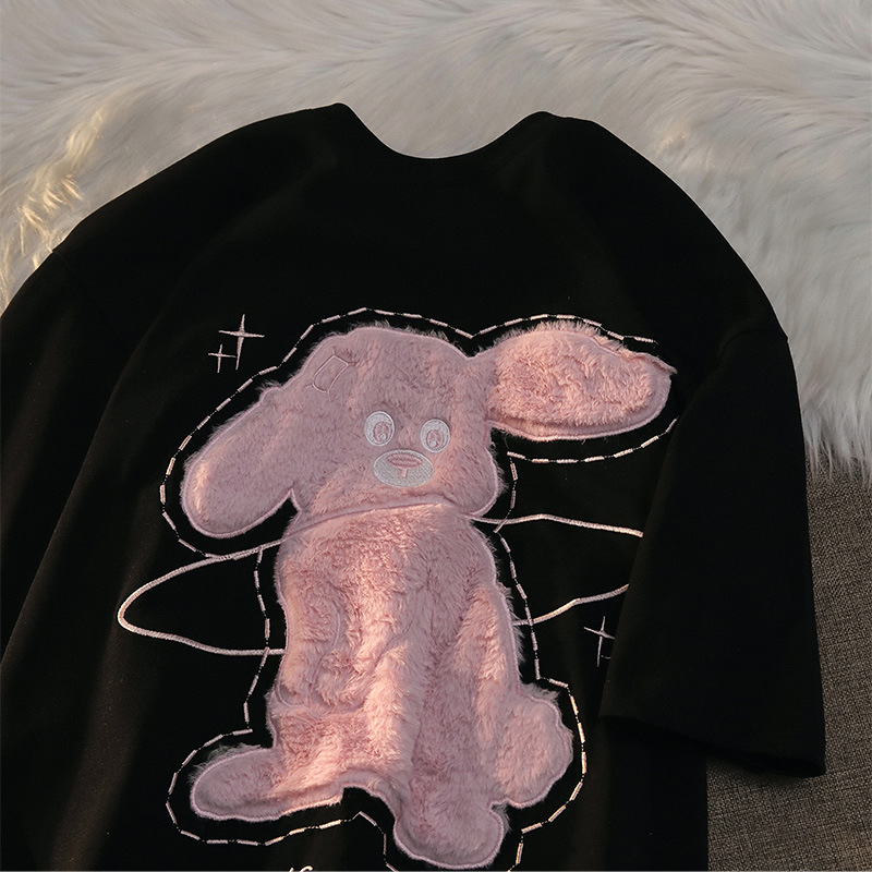 美式短袖男女植绒卡通毛绒兔子刺绣宽松inst恤小众百搭情侣上衣