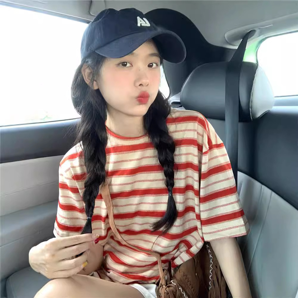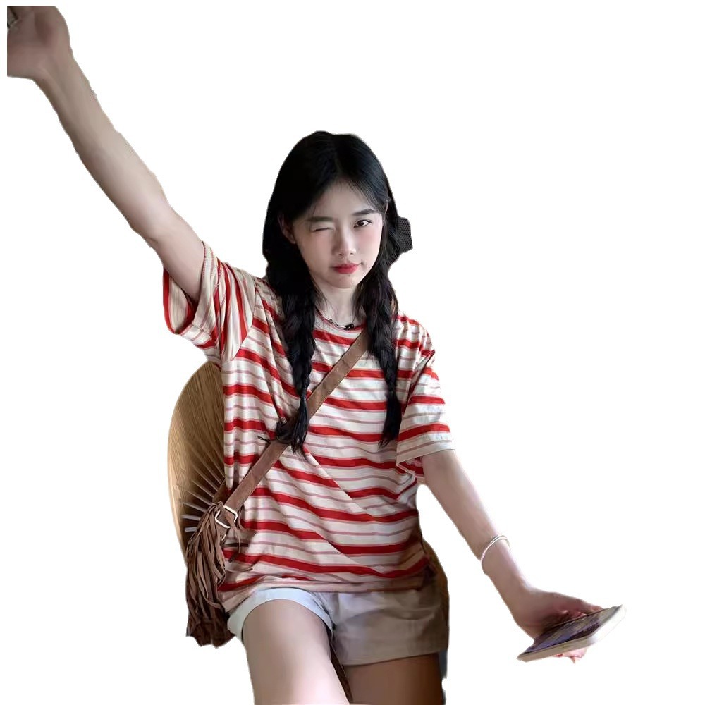 拼色条纹短袖T恤女夏季新款宽松休闲百搭圆领套头学生上衣ins