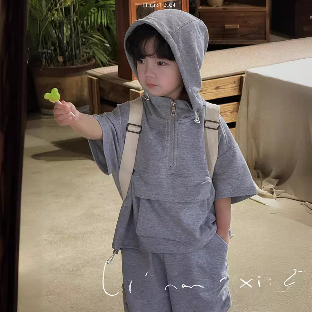 24夏新品儿童短袖工装风拉链T恤衫针织条纹酷帅运动型男帽衫上衣