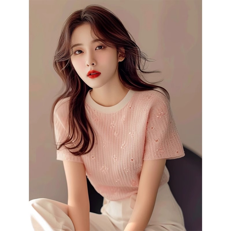 粉色针织短袖t恤女新款欧货洋气小衫夏季甜美上衣超好看正肩