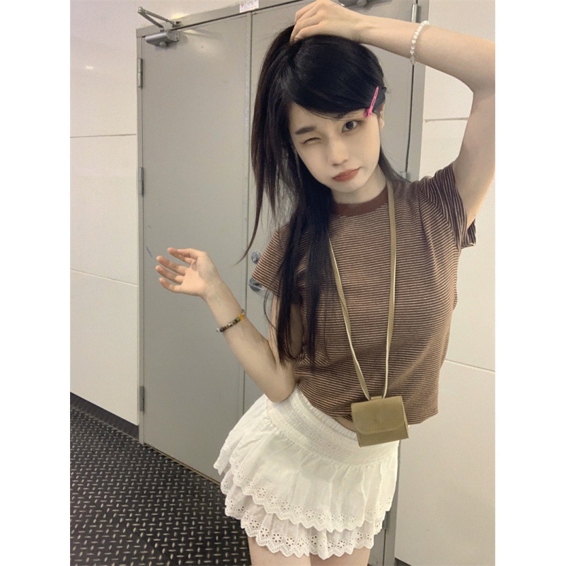 复古短袖条纹T恤女夏季辣妹修身显瘦打底衫百搭学生短款上衣