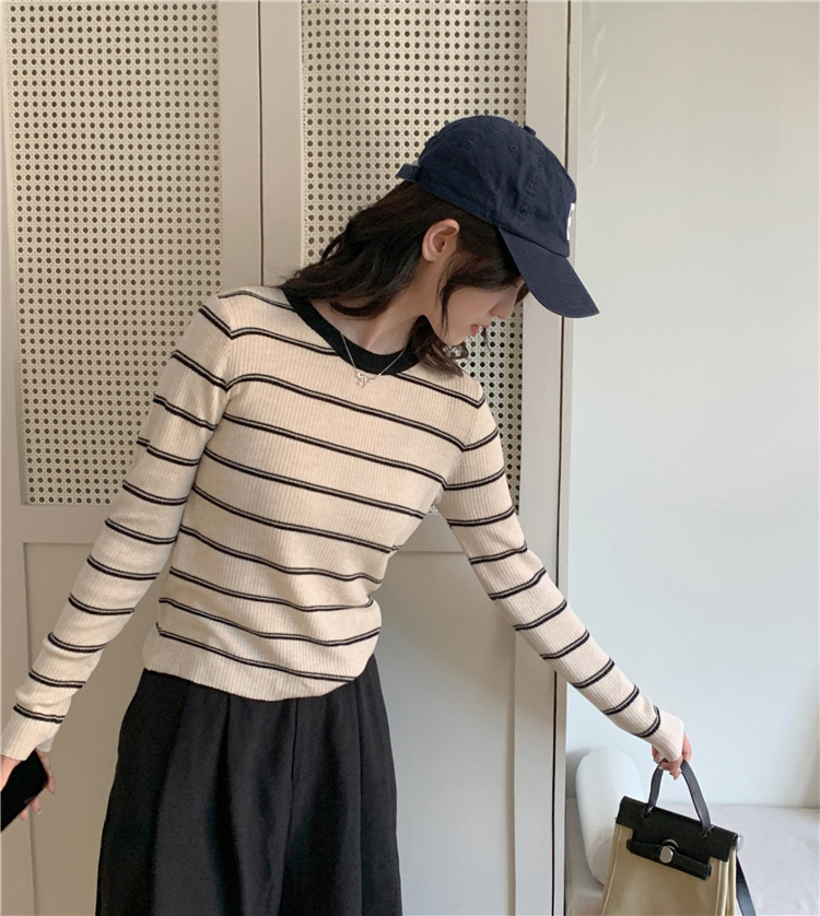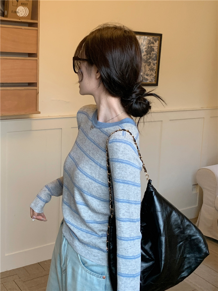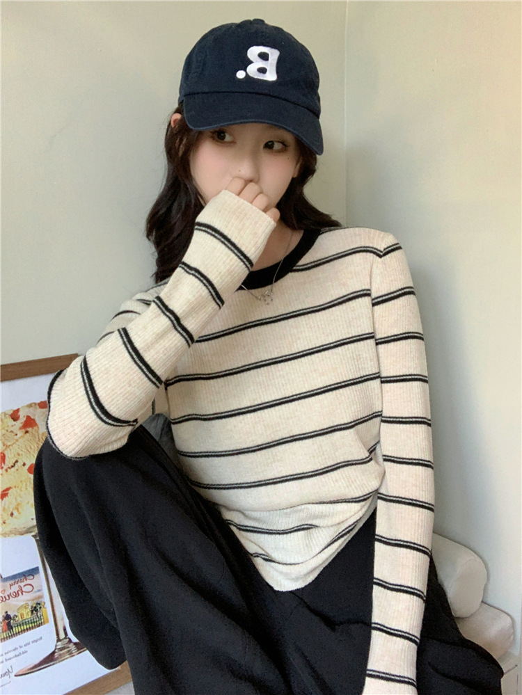 6019#秋韩版新款圆领套头撞色条纹拼接显瘦小众百搭长袖针织衫女
