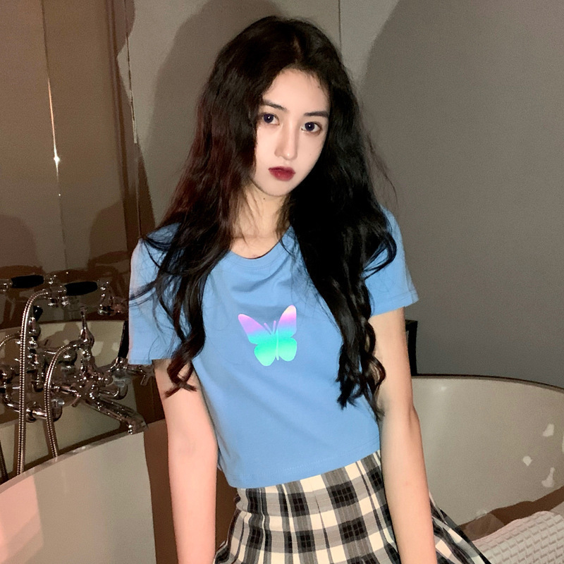 年夏季新款网红情侣装反光蝴蝶短袖t恤女ins超火短款学生上
