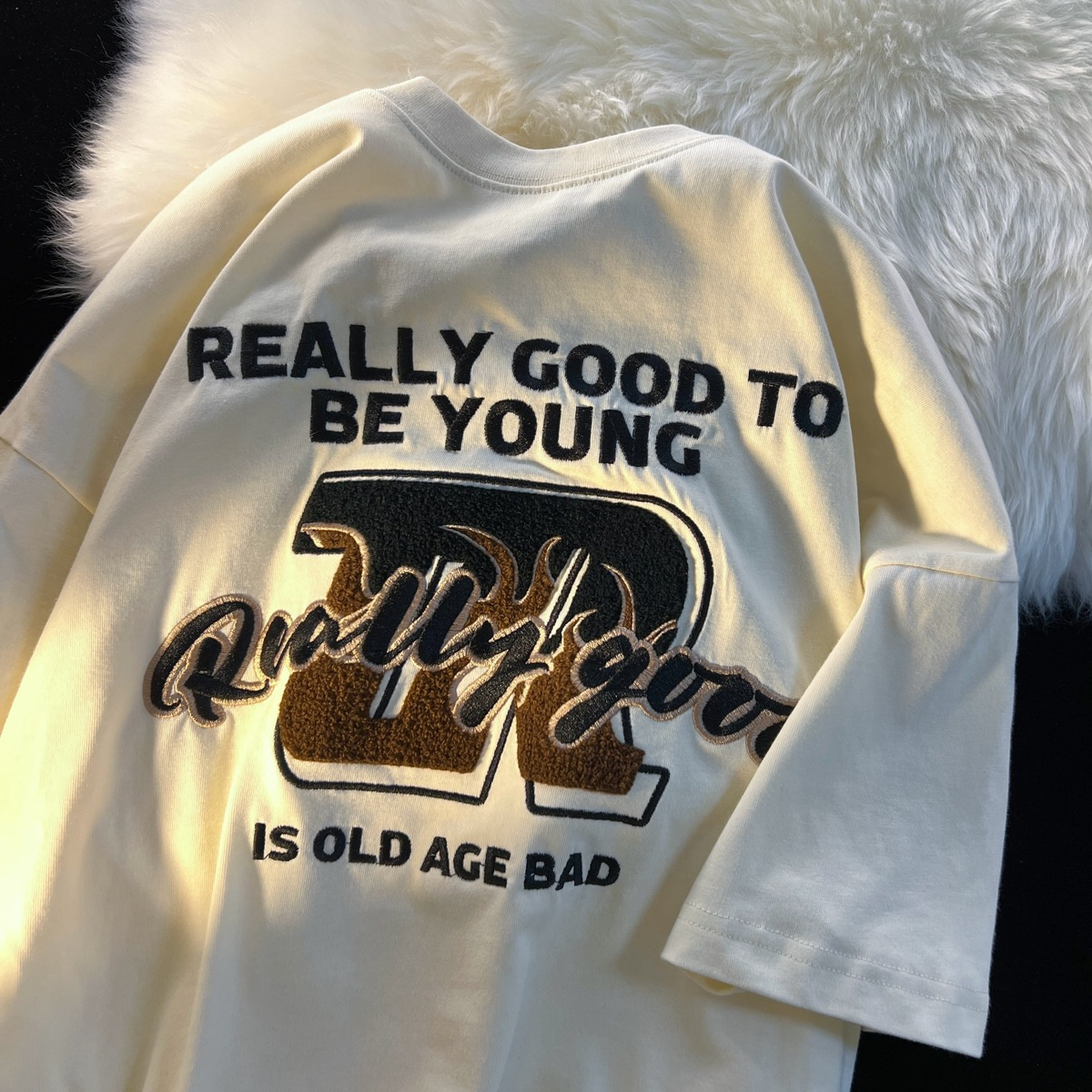 QFD-纯棉美式复古字母植绒刺绣情侣夏装短袖T恤女宽松设计感上衣