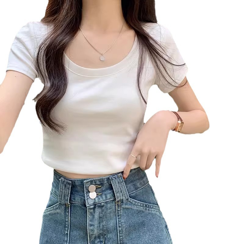 美式正肩短袖U领短款T恤女夏季修身显瘦辣妹露脐高腰学生上衣