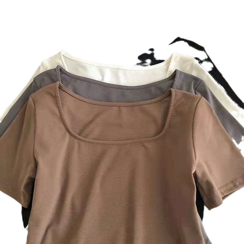 弧度下摆U领短袖女夏季T恤新款纯色修身百搭锁骨打底衫上衣潮