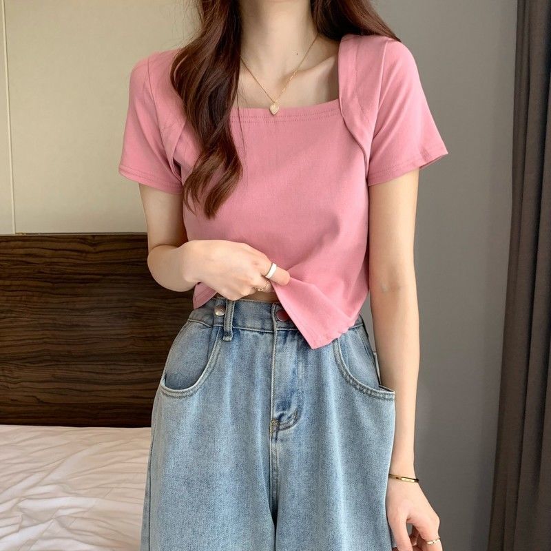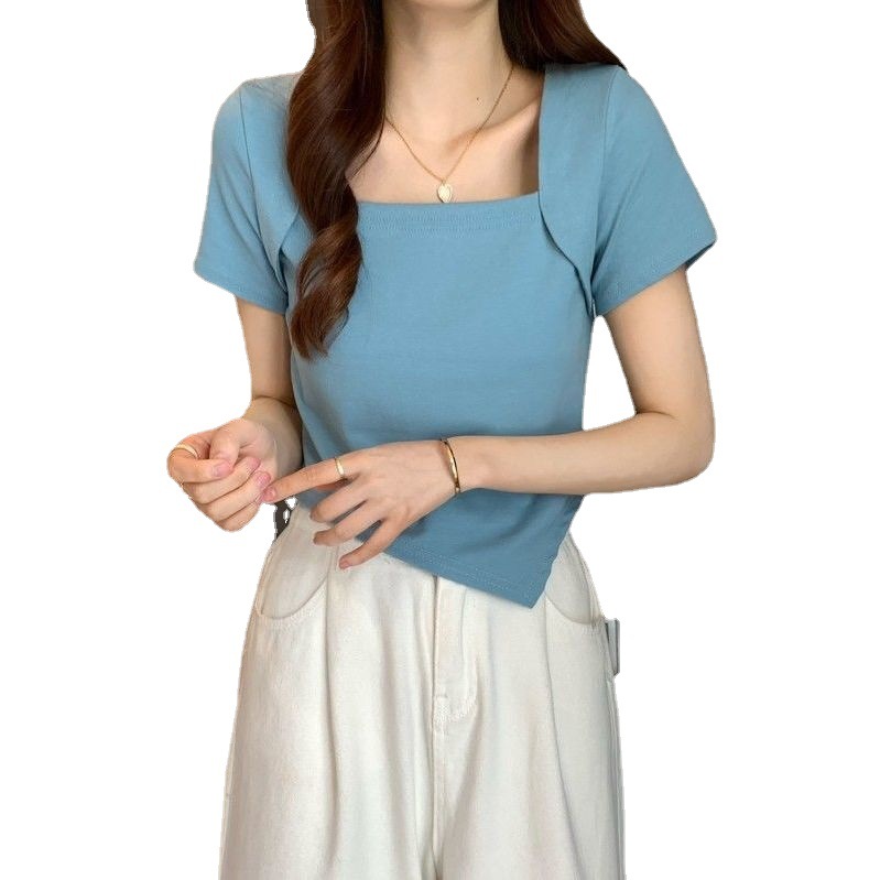 2022年夏季方领不规则短袖t恤女纯色泫雅风修身显瘦别致短款上衣