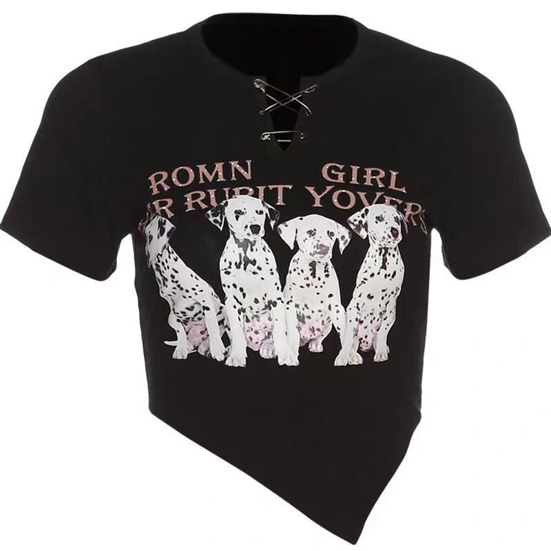 6535棉 印花短袖T恤女设计感2023夏季新款不规则辣妹短款学生上衣
