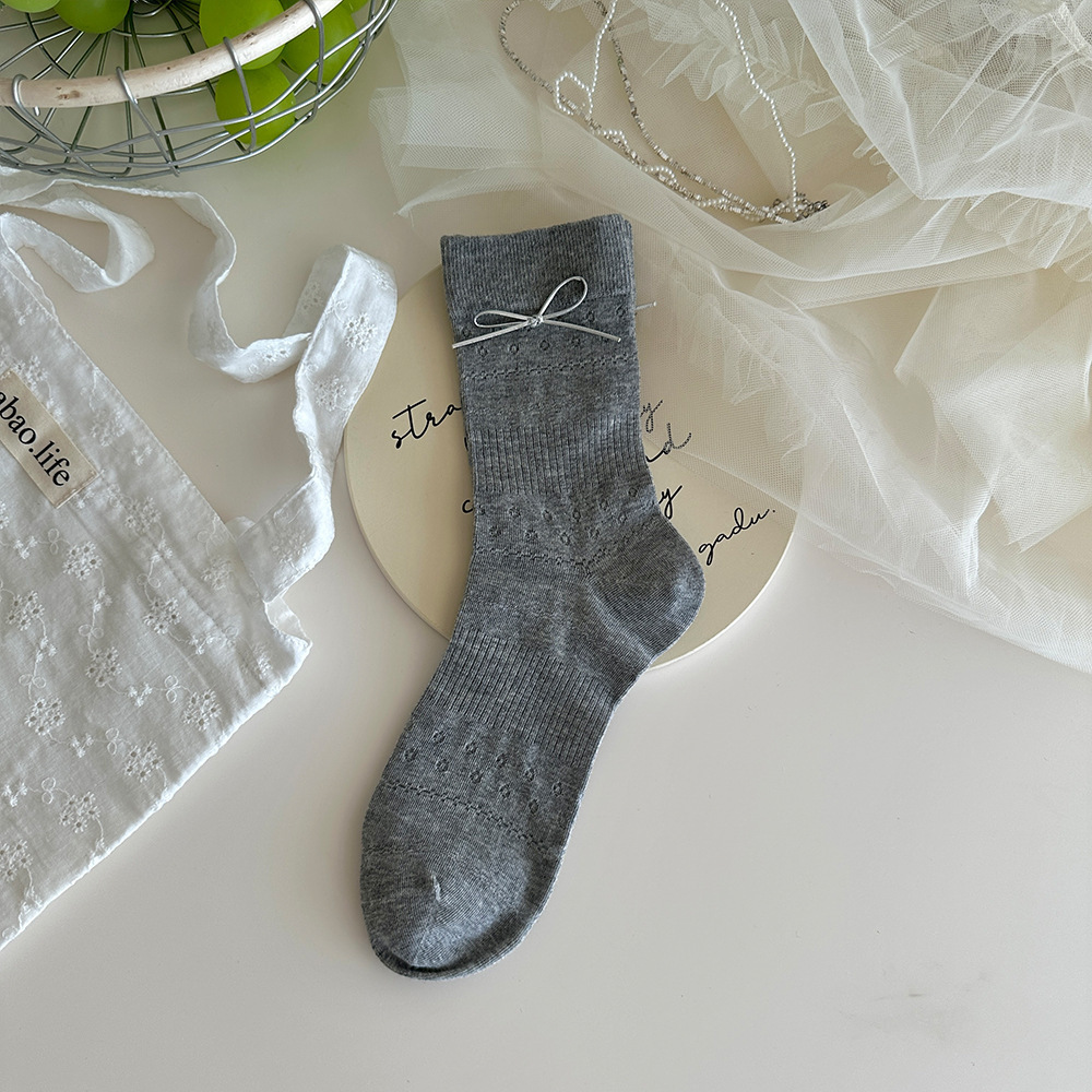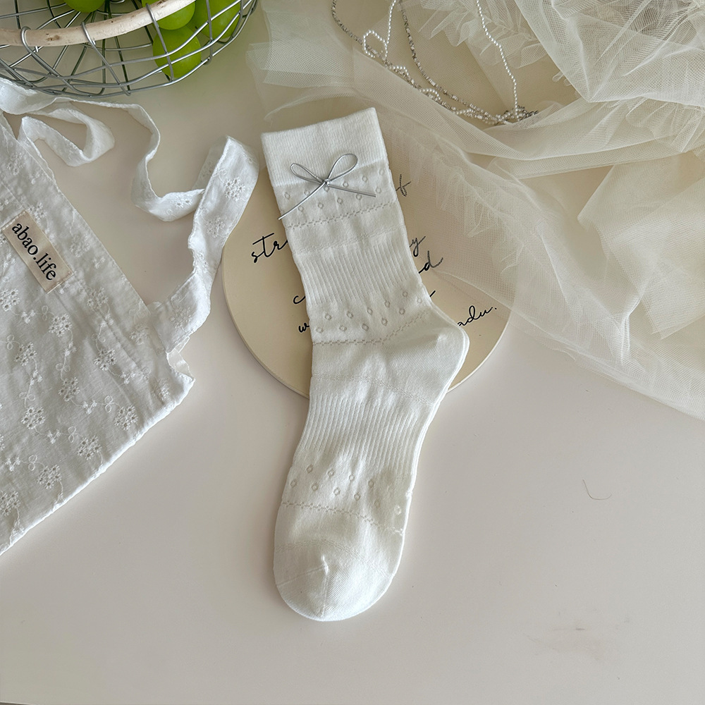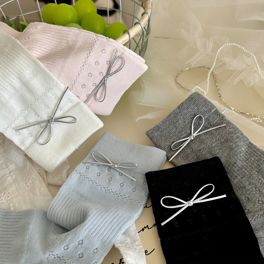 songmu淞木'皮质蝴蝶结无骨袜子女中筒袜春夏薄款镂空棉质堆堆袜