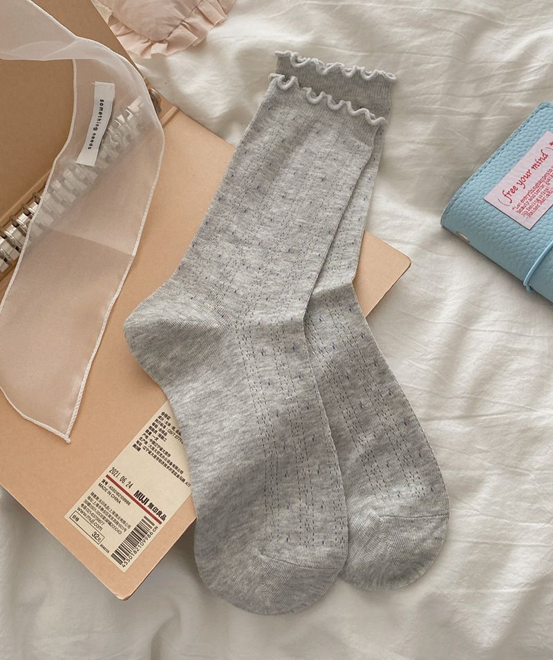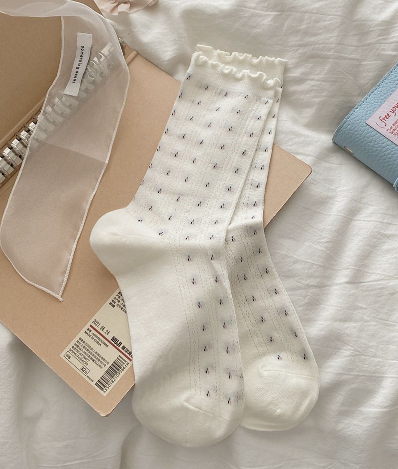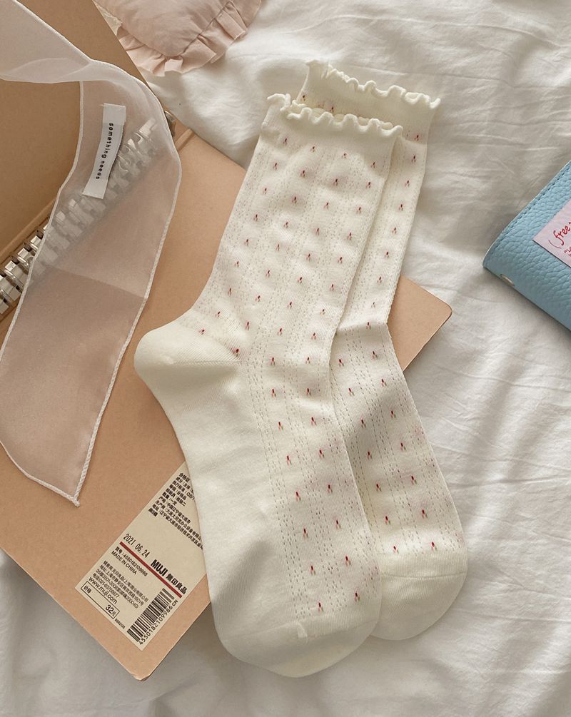 日系网眼小碎花木耳边棉质无骨中筒袜子薄 卷边不勒脚月子袜透气