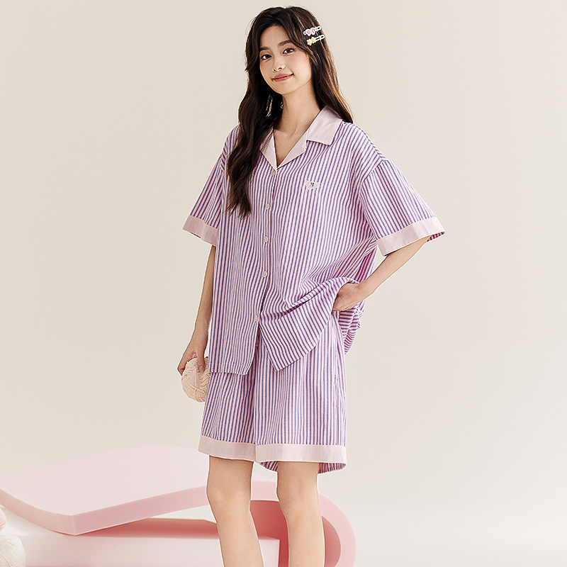 甜美少女粉色可颂条纹短袖睡衣春夏新款显瘦翻领休闲家居服可外穿