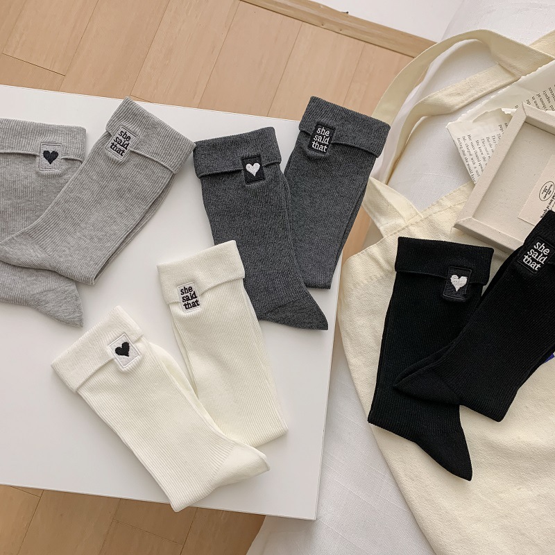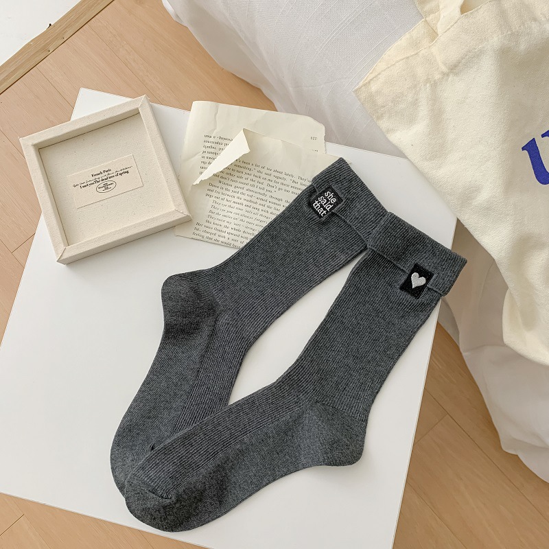 灰色袜子女春夏季纯色简约中筒袜AB款爱心刺绣复古日系百搭堆堆袜