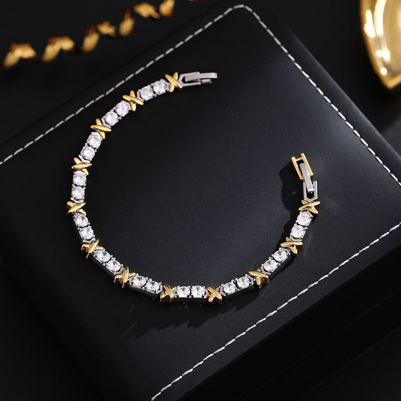T家轻奢镶嵌锆石满钻项链套装设计感金银间色拼接字母X手链