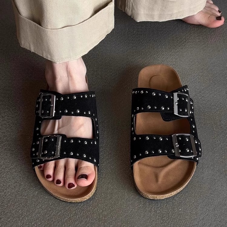 法式复古厚底拖鞋女外穿夏季新款时尚铆钉一字皮带扣勃肯凉拖鞋