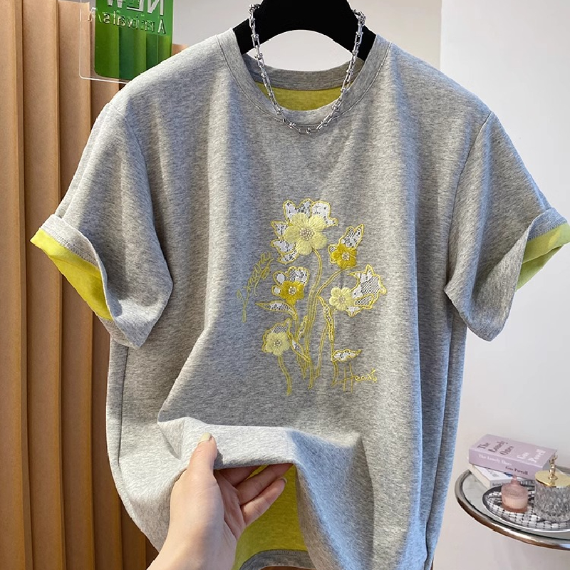 新款重工刺绣花朵短袖t恤女夏季新款宽松显瘦百搭上衣潮撞色半袖