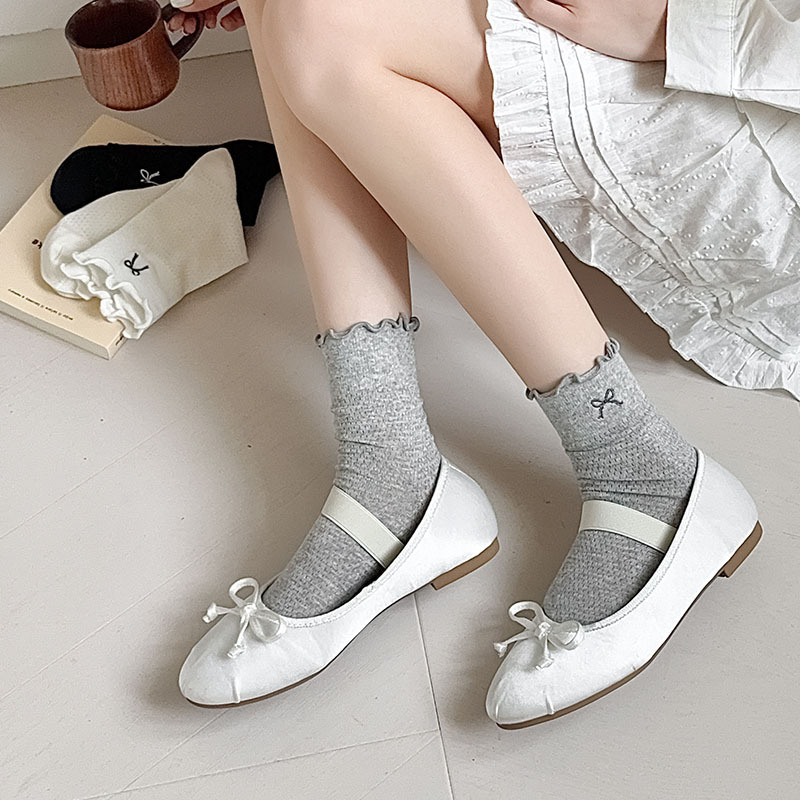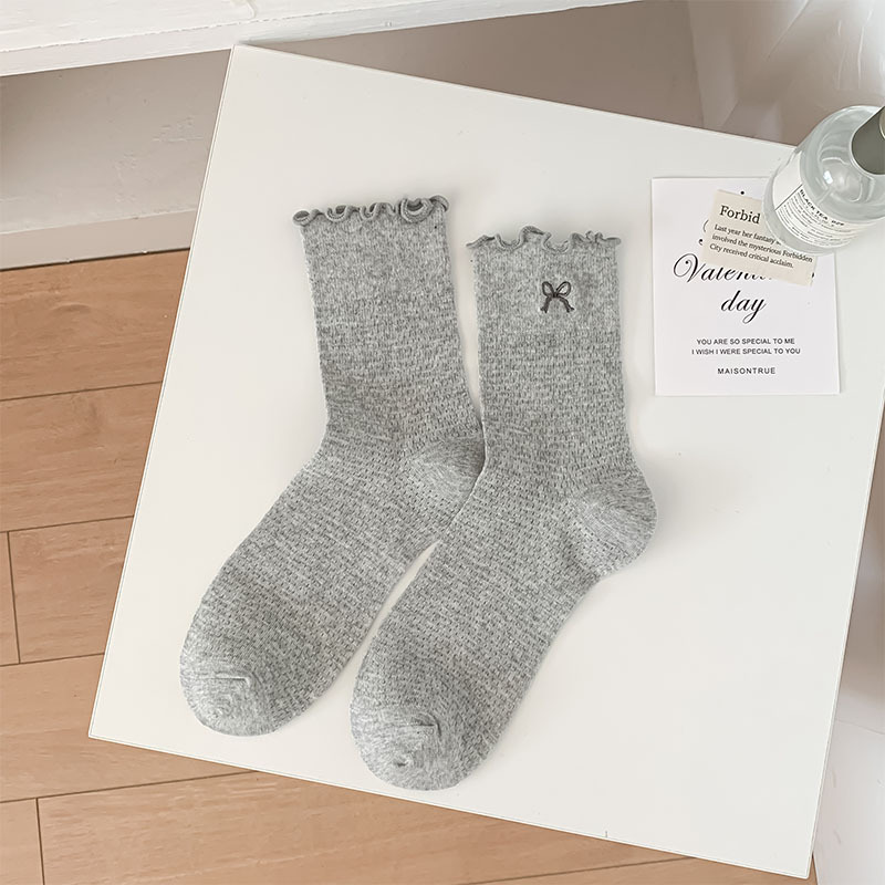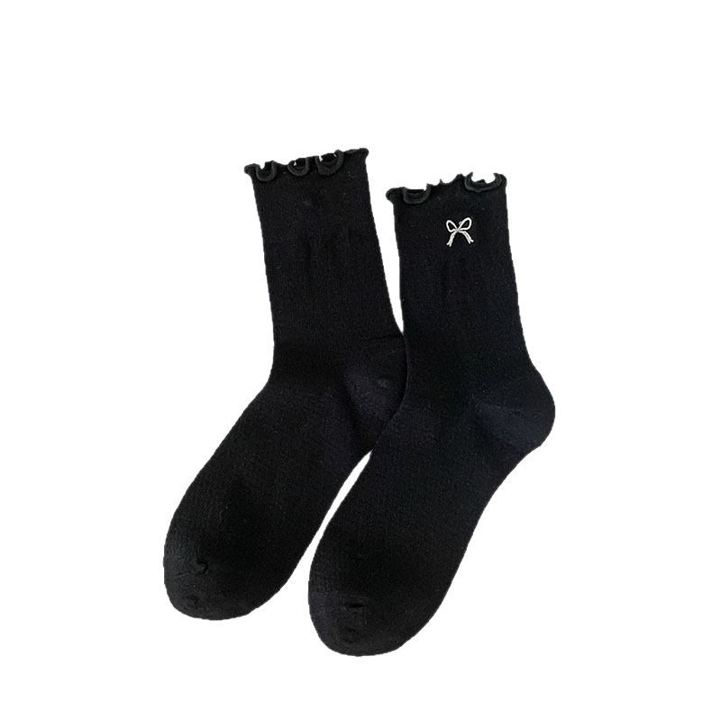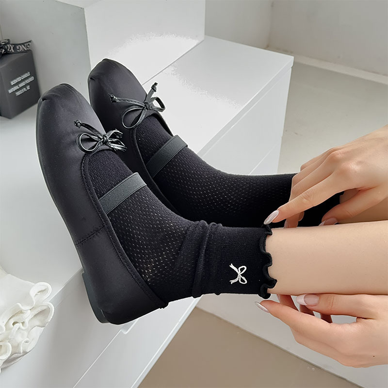 芭蕾风蝴蝶结刺绣袜子女夏季薄款镂空网眼透气黑白色木耳边中筒袜