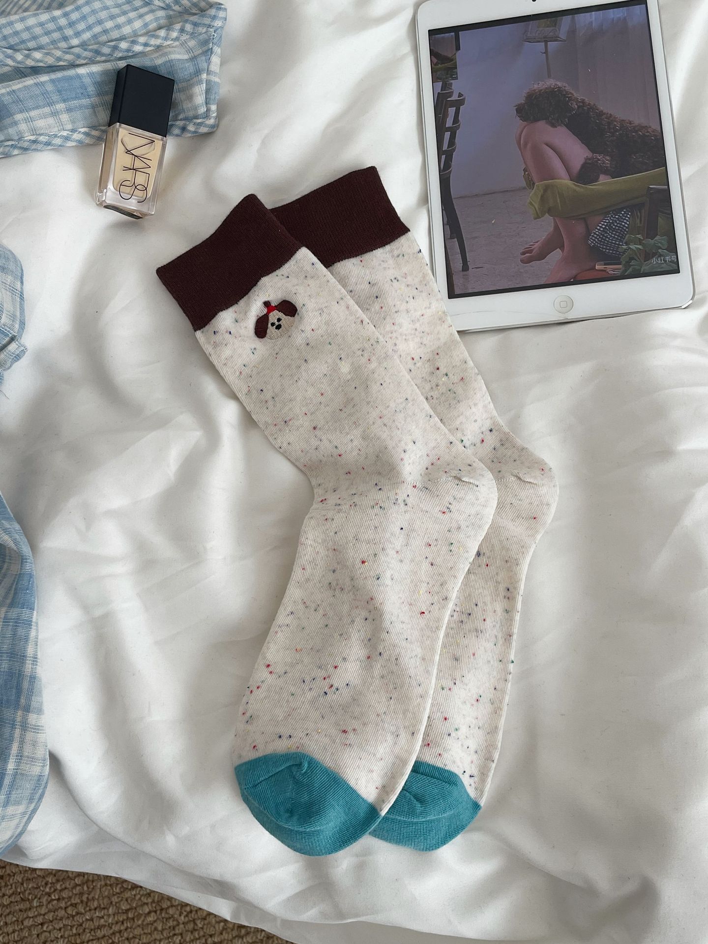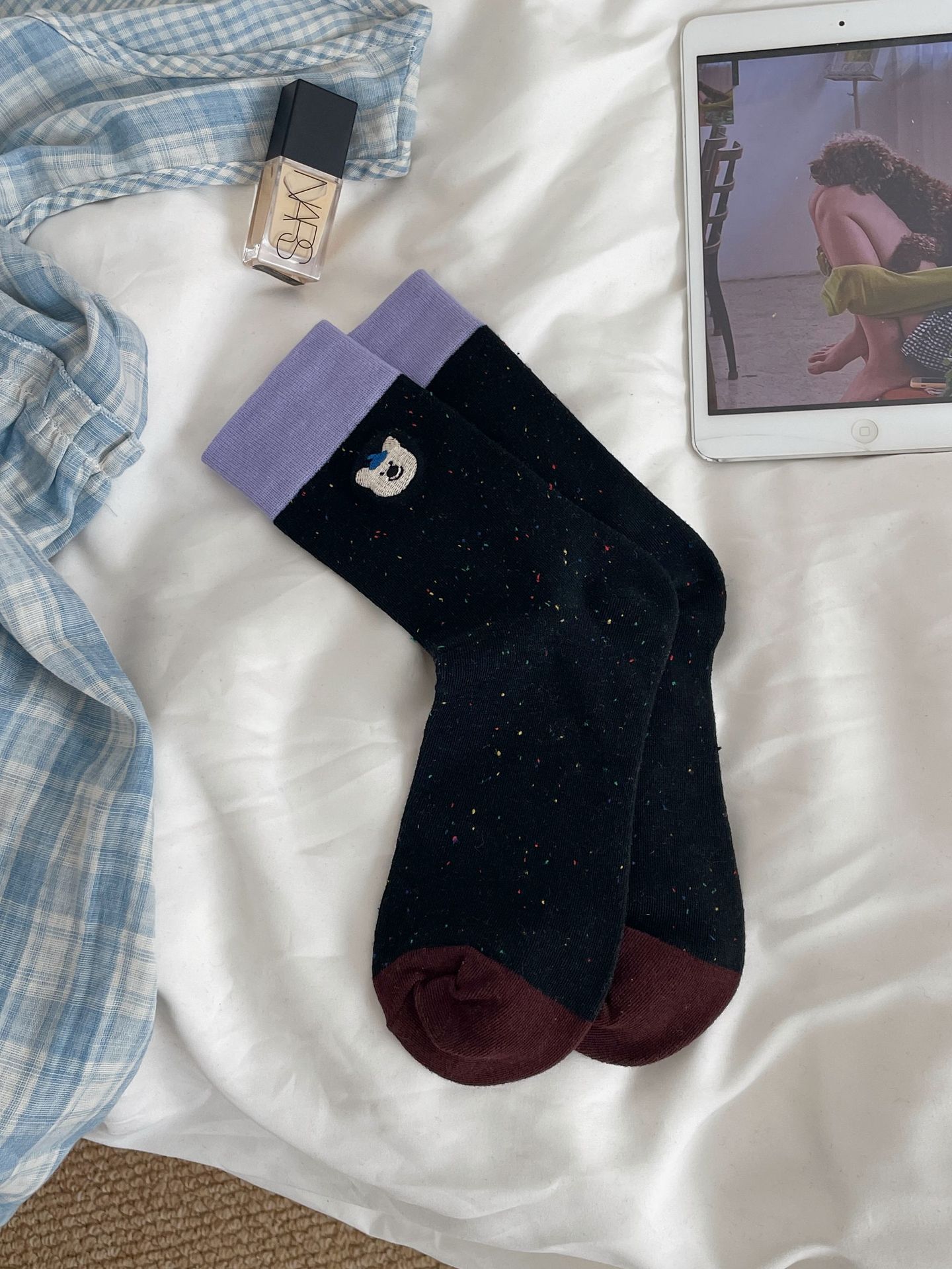 春夏无骨点子纱棉袜拼色刺绣小熊中筒堆堆袜可爱学院风女袜ins潮