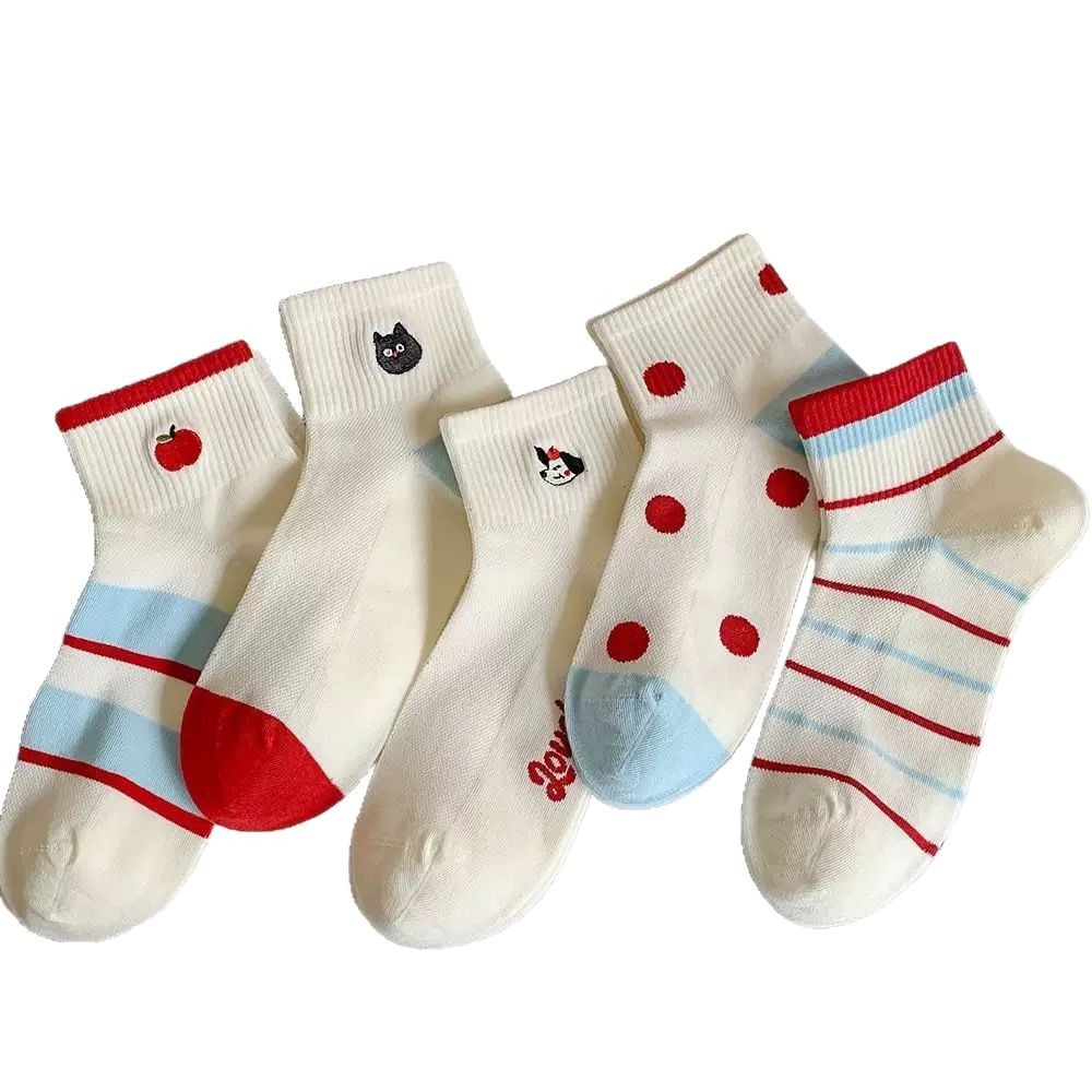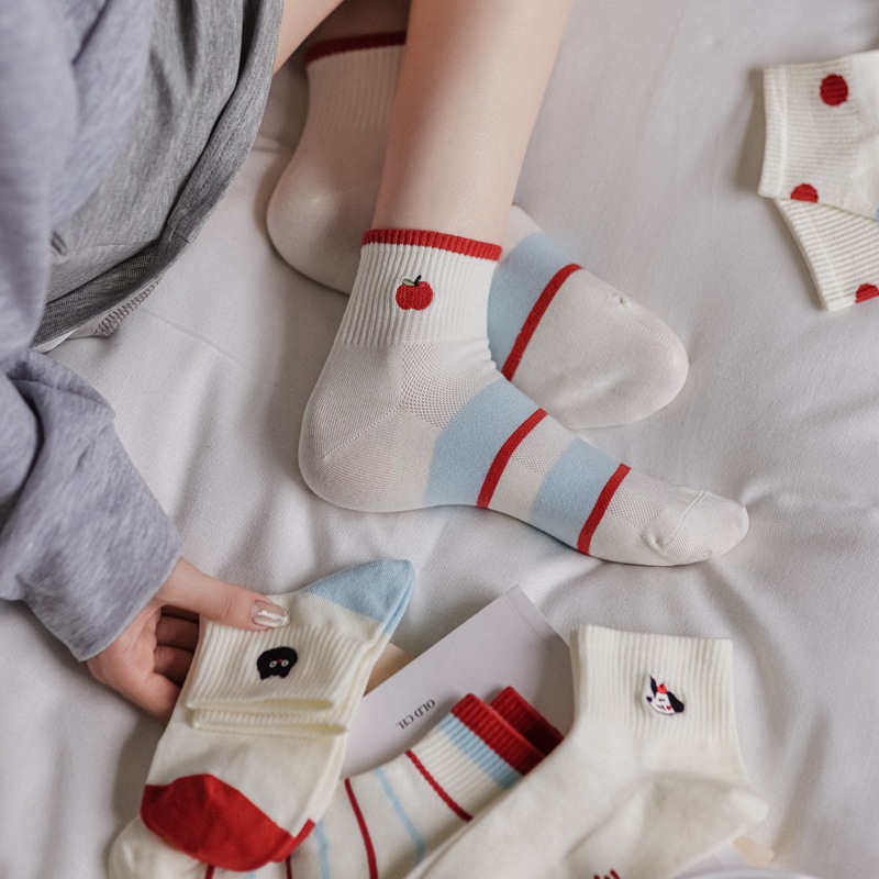 春夏可爱卡通刺绣苹果短筒女袜百搭撞色波点日系学院风船袜女