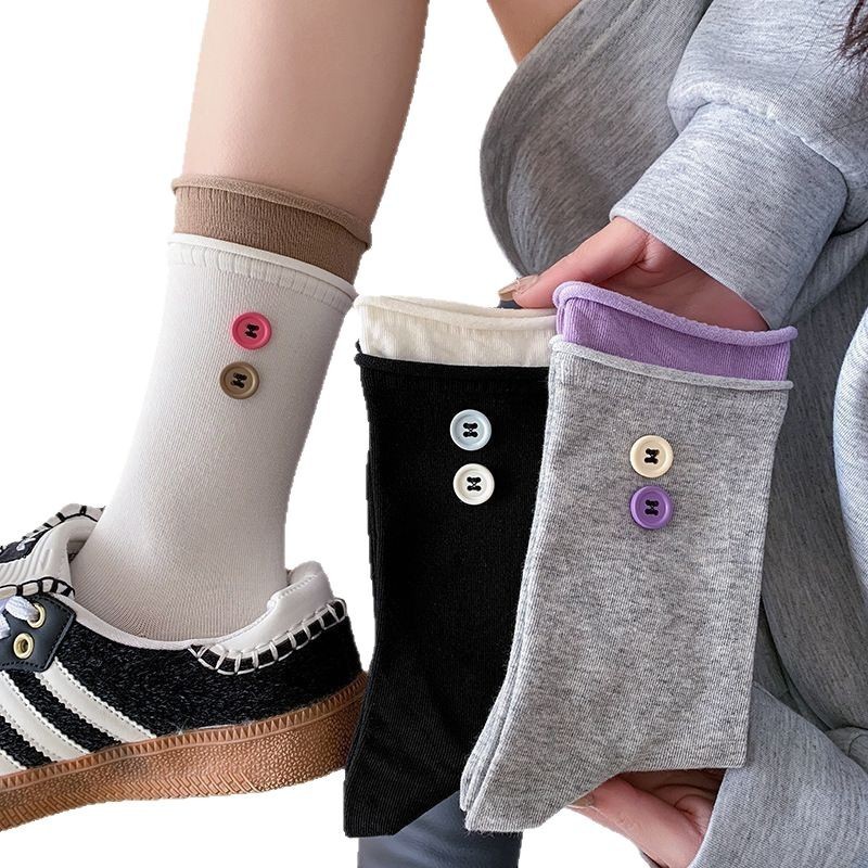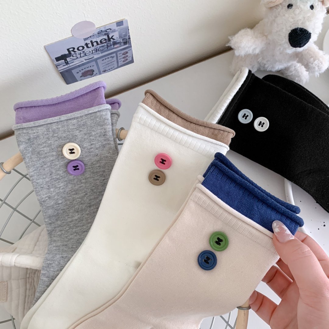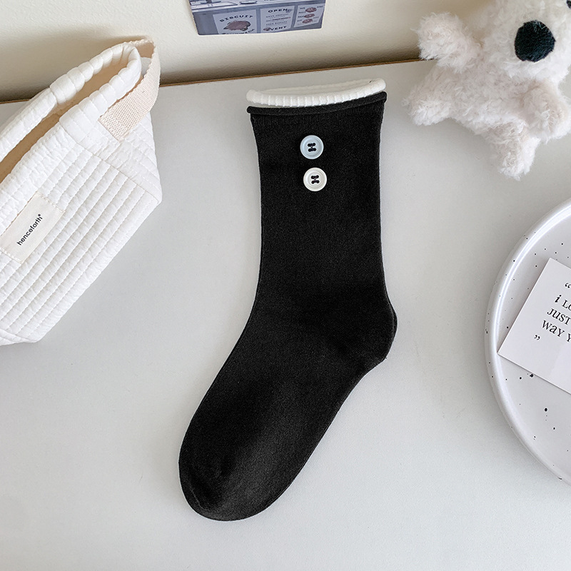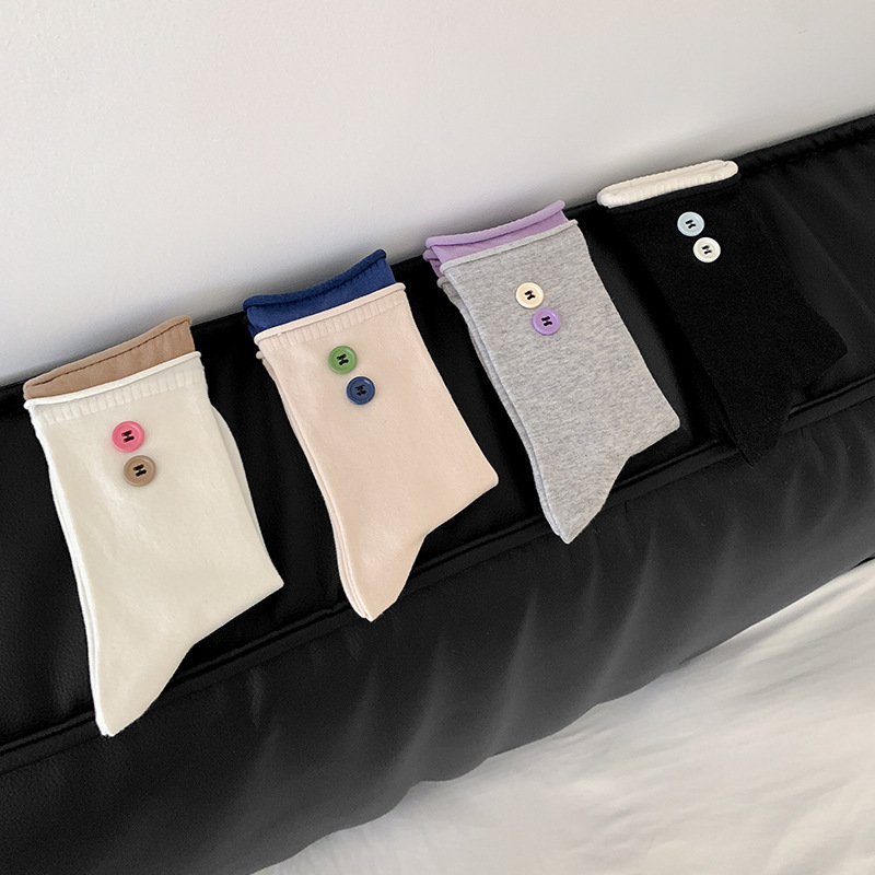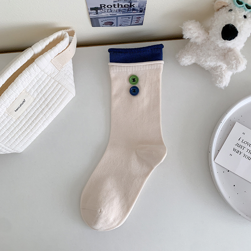 双层卷边罗口拼色袜子女ins潮饰品小纽扣韩国东大门jk潮袜女学生