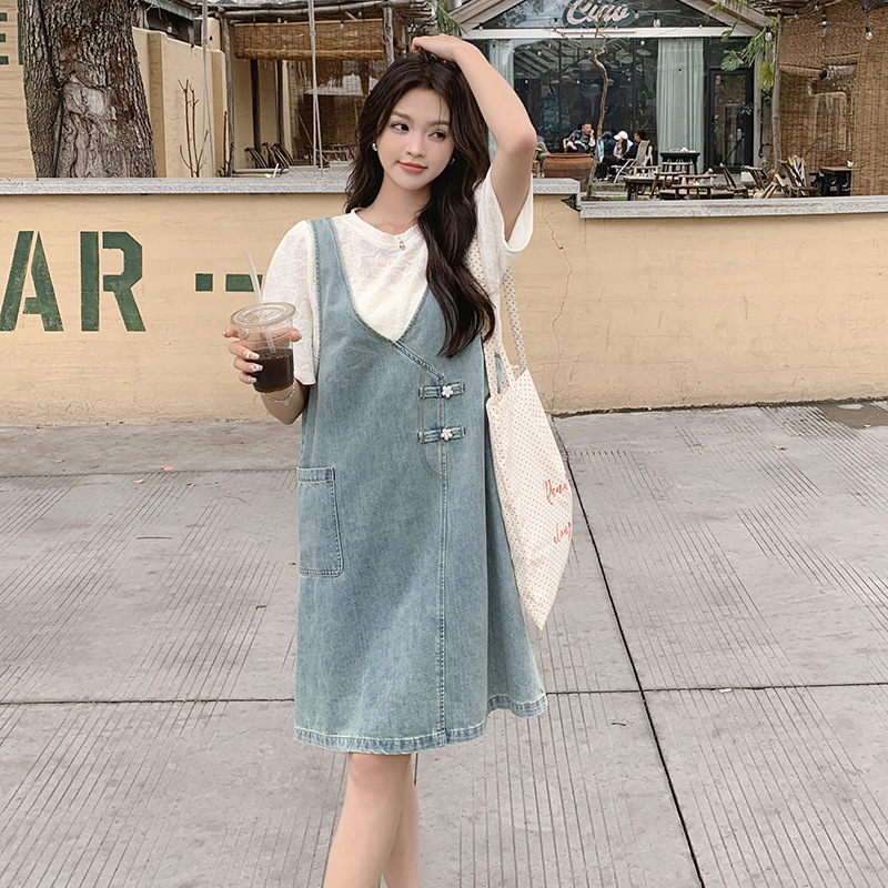 中式牛仔背带裙套装女圆领针织绣花短袖上衣国风盘扣连衣裙两件套