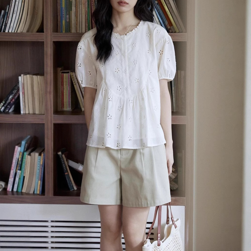 白色绣花镂空泡泡袖衬衫女夏季法式木耳边棉圆领娃娃衫上衣